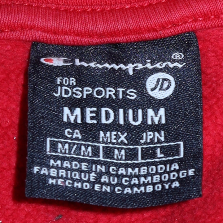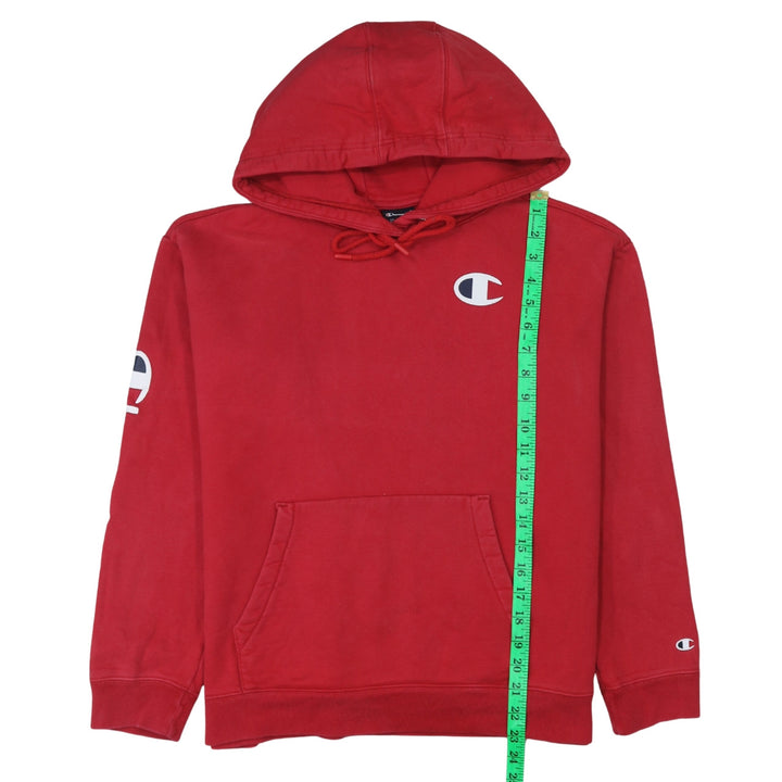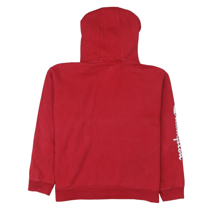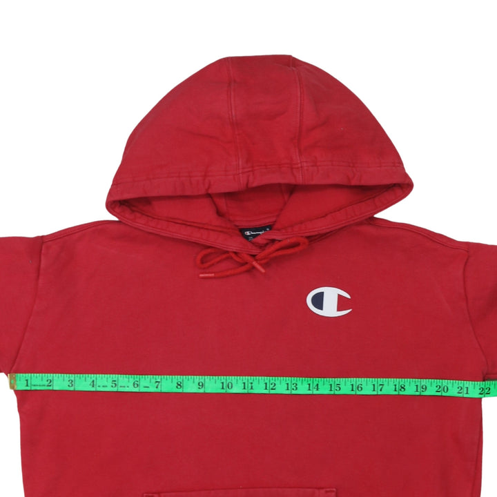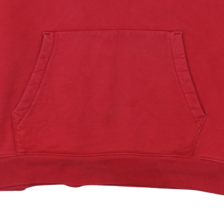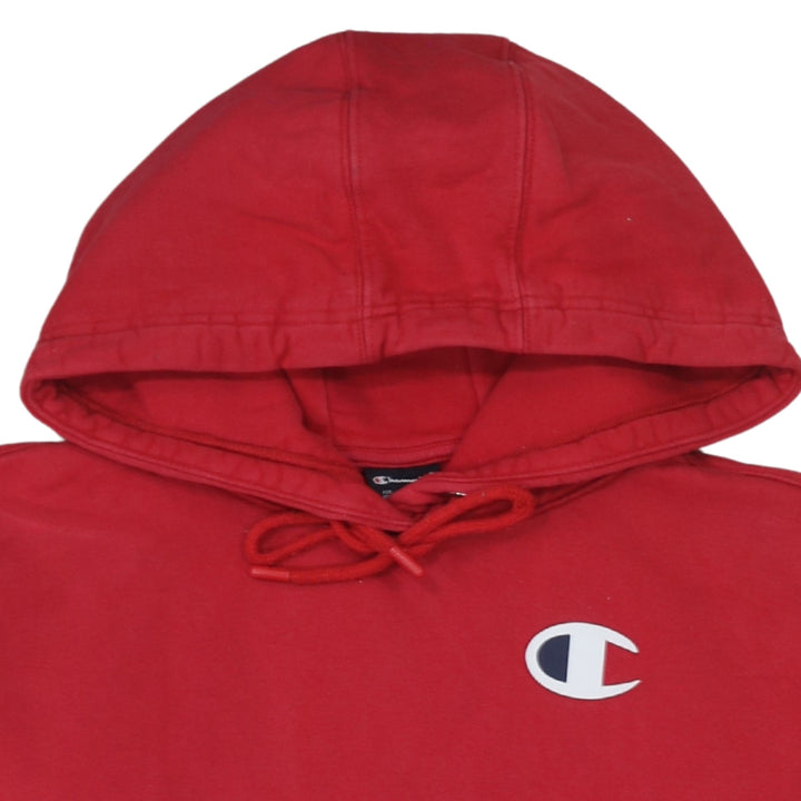 This classic red Champion hoodie is a deadstock item, meaning it's new with tags or in unworn condition. It's crafted from soft cotton for comfort and features the iconic Champion 'C' logo embroidered on the chest and again on the sleeve, adding a touch of athletic heritage. The hoodie includes a drawstring for adjustable fit and a convenient front pouch pocket. Perfect for layering or wearing on its own for a casual, sporty look.