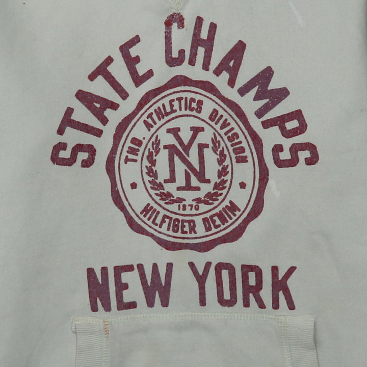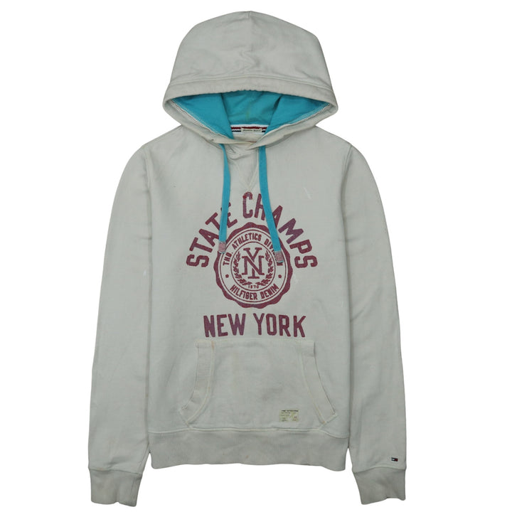 Tommy Hilfiger, Hilfiger Denim, Tommy Hilfiger hoodie, cream hoodie, beige cream hoodie, teal hood lining, blue drawstring, men's hoodie, men's small hoodie, pullover hoodie, hooded sweatshirt, casual hoodie, fleece hoodie, printed logo hoodie, State Champs New York, collegiate hoodie, graphic hoodie, long sleeve hoodie, kangaroo pocket hoodie, front pocket hoodie, ribbed cuffs, ribbed hem, cosy hoodie, loungewear top, casual top, everyday hoodie, athletic style hoodie, New York print hoodie, branded hoodie, designer hoodie, small mens hoodie, relaxed fit hoodie, cotton blend hoodie, cream pullover, cream sweatshirt, Hilfiger graphic top, neutral colour hoodie, winter layer, autumn layer, street casual outfit, layered look, second hand Tommy Hilfiger, pre-owned Tommy hoodie, men's casualwear, fleece top, sports inspired hoodie, logo sweatshirt