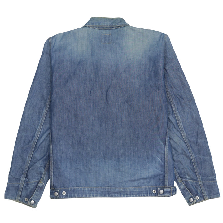Carhartt, Carhartt jacket, Carhartt denim jacket, light blue denim jacket, men's denim jacket, men's Carhartt, Carhartt workwear, workwear jacket, casual jacket, full zip jacket, zip front jacket, light wash denim, faded denim jacket, medium size jacket, men's medium jacket, relaxed fit jacket, casual outerwear, everyday jacket, layering piece, classic collar jacket, zip chest pocket, front welt pockets, adjustable hem tabs, adjustable cuffs, long sleeve jacket, blue jean jacket, trucker style jacket, work jacket, casual workwear, Carhartt outerwear, men's light blue jacket, cotton denim jacket, A grade condition, pre-owned Carhartt, cool weather layer, spring jacket, autumn jacket, versatile denim, wardrobe staple, men's fashion, casual menswear, zipped denim jacket, Carhartt medium, light wash Carhartt