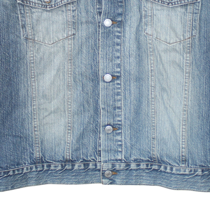 Retro denim jacket, Retro denim trucker, Retro light blue jacket, men's denim jacket XLarge, men's XL denim, light blue faded denim, faded wash denim jacket, casual denim outerwear, men's casual jacket, button front denim, chest pockets jacket, metal button jacket, classic denim trucker, relaxed fit denim, oversized denim jacket, long sleeve denim, collared denim jacket, blue jean jacket, men's blue jean coat, everyday layering jacket, casual outerwear men, Retro menswear, A vintage quality denim, wardrobe staple jacket, timeless denim style, button fastening jacket, adjustable hem tabs, contrast stitching denim, washed blue jacket, casual layering piece, mens light wash denim, trucker jean jacket, classic jean coat, faded blue jean jacket, XL denim outerwear, casual weekend jacket, style staple denim, durable denim fabric, vintage look jacket, men's fashion jacket, blue outerwear men's, casual street jacket, layering over hoodie, layering over t shirt, all season denim jacket, comfortable relaxed fit, versatile blue jacket, retro style denim, timeless jean jacket