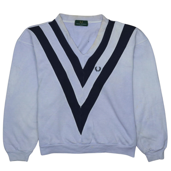 Fred Perry Navy Blue Jumper Women’s Large Embroidered Chest Logo Stripe Knit Sweater