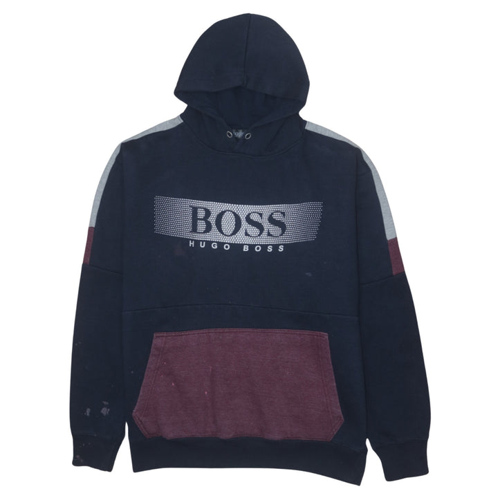 HUGO BOSS hoodie, HUGO BOSS sweatshirt, BOSS hoodie large, navy BOSS hoodie, navy colour block hoodie, men's HUGO BOSS top, men's navy hoodie, large printed logo hoodie, BOSS logo sweatshirt, fleeced hoodie, casual hoodie, loungewear top, pullover hooded sweatshirt, navy grey burgundy hoodie, colour block pullover, men's casual wear, relaxed fit hoodie, oversized style hoodie, branded logo jumper, designer hoodie, designer sweatshirt, everyday hoodie, comfy fleece hoodie, long sleeve hoodie, front pocket hoodie, graphic logo top, menswear hoodie, layered outfit top, autumn hoodie, winter hoodie, sporty hoodie, casual street hoodie, navy blue jumper, cotton blend hoodie, soft fleece lining hoodie, BOSS chest print, statement logo hoodie, second hand HUGO BOSS, pre-owned designer hoodie, men's large hoodie, chest 26 inch hoodie, length 28 inch hoodie, arm 23 inch sleeve, used HUGO BOSS sweatshirt, bargain designer hoodie, navy pullover sweatshirt, hooded fleece top