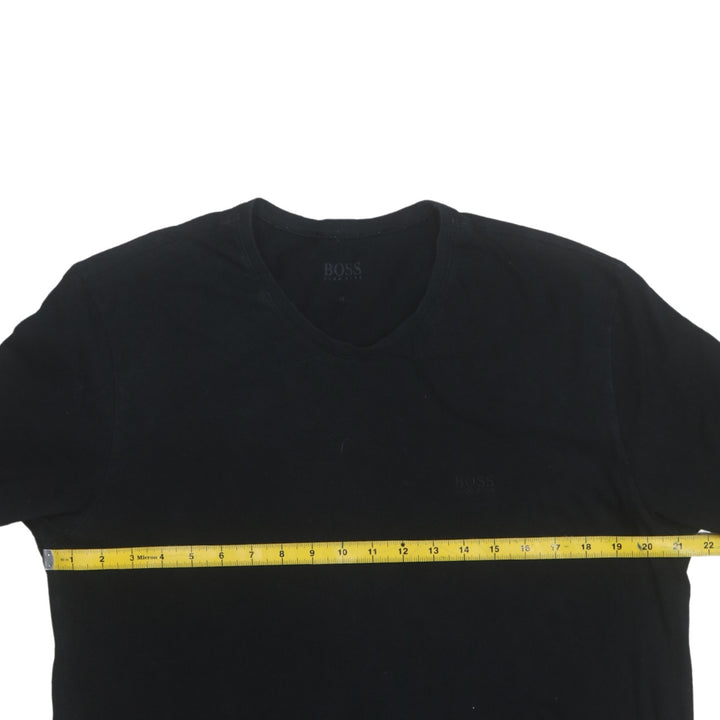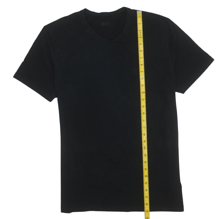 Hugo Boss, Boss, black T-shirt, black tee, men's T-shirt, men's tee, men's XLarge, XL, casual top, short sleeve top, crewneck T-shirt, crew neck tee, minimalist T-shirt, logo T-shirt, subtle logo, basic tee, classic black tee, cotton T-shirt, soft jersey top, casual wear, everyday T-shirt, loungewear top, Hugo Boss menswear, designer T-shirt, plain black T-shirt, wardrobe staple, breathable T-shirt, relaxed fit tee, oversized style, chest 21.5 inch, length 29 inch, arm 3 inch, smart casual, layering piece, summer top, spring outfit, autumn layering, street casual, high quality T-shirt, pre-owned Hugo Boss, second hand designer, A grade condition, timeless basic, solid colour T-shirt, short sleeve casual wear