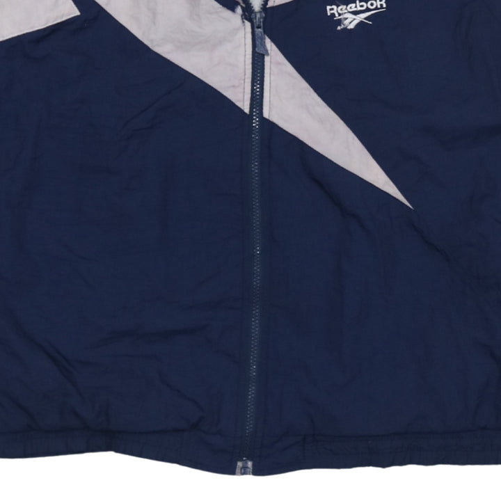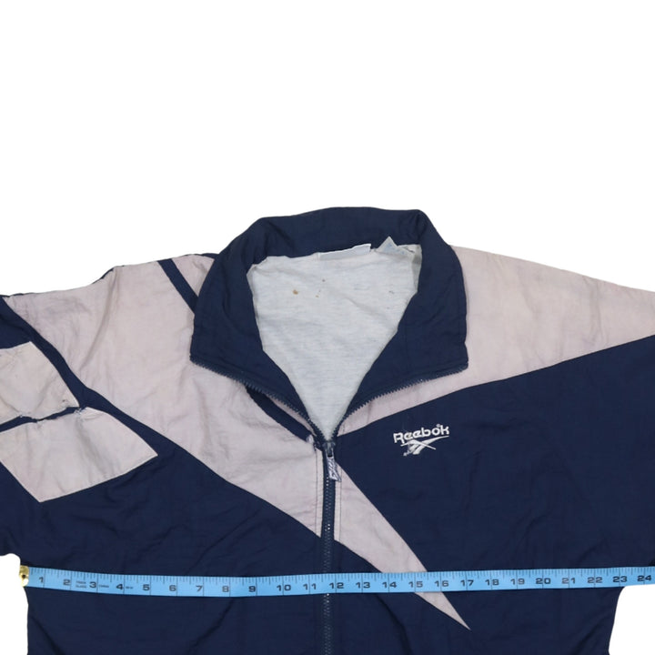 Reebok, Reebok jacket, Reebok windbreaker, Reebok track jacket, navy Reebok, navy blue jacket, blue windbreaker, women's Reebok, women's jacket, women's windbreaker, XLarge jacket, XL jacket, relaxed fit jacket, oversized fit, full zip jacket, zip front jacket, track top, sports jacket, athletic jacket, colour block jacket, colour-block windbreaker, embroidered logo jacket, lightweight outerwear, polyester jacket, casual outerwear, everyday jacket, running jacket, training jacket, gym cover up, spring jacket, autumn jacket, festival jacket, activewear top, long sleeve jacket, elasticated hem, elasticated cuffs, stand collar jacket, navy blue track top, branded jacket, logo jacket, classic sportswear, casual sports jacket, athleisure jacket, Reebok XL, women's sportswear, women's outerwear, pre-owned Reebok, second hand Reebok, A grade condition, chest 23 inches, length 24 inches, arm 20 inches
