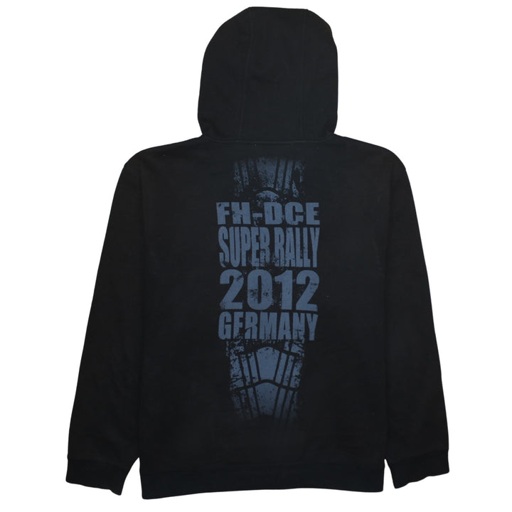 This Harley Davidson full zip hoodie is a great rally piece, featuring a bold FH-DCE Super Rally 2012 Germany back print and embroidered chest patch. The relaxed XL fit, soft interior and practical front pockets make it perfect for layering on cooler days or throwing on over a tee. Ideal for fans of Harley events and collectors looking for a comfortable everyday hoodie with authentic biker styling.