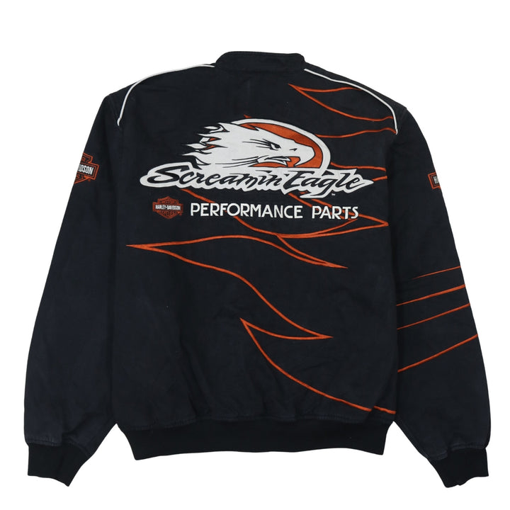 Harley Davidson, Harley Davidson jacket, Harley Davidson racing, Harley jacket XLarge, Harley Davidson black jacket, black Harley Davidson racing jacket, Screamin Eagle jacket, Screamin Eagle Performance Parts, men's Harley Davidson, men's racing jacket, men's biker jacket, embroidered Harley logo, flame graphic jacket, motorcycle jacket, biker style outerwear, full zip jacket, windbreaker jacket, polyester wool jacket, Harley Davidson XL, Harley Davidson flame design, Harley Davidson embroidered chest, Harley Davidson back logo, casual outerwear, Harley fan apparel, collectible Harley jacket, motorbike clothing, Harley Davidson menswear, black and orange jacket, logo jacket, graphic jacket, relaxed fit jacket, oversized fit jacket, ribbed hem jacket, ribbed cuffs jacket, zip pockets jacket, Harley Davidson patch, Harley Davidson sleeve logo, classic Harley piece, Harley Davidson clothing, Harley Davidson coat, vintage Harley jacket, mens XLarge jacket, street casual jacket, everyday outerwear, bold logo jacket, statement jacket, moto style jacket