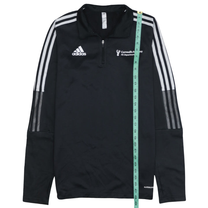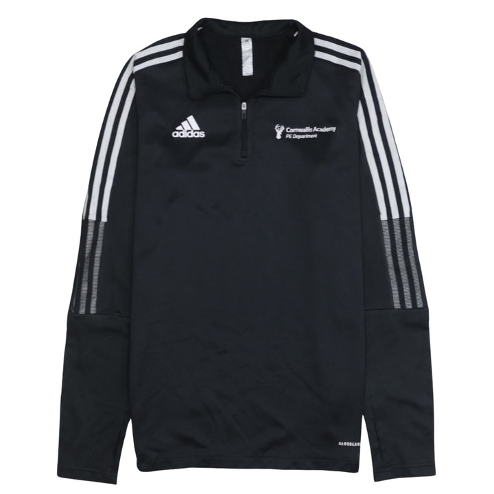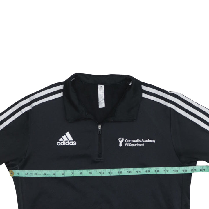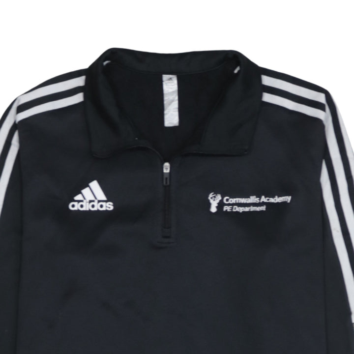 Adidas, Adidas top, Adidas sweatshirt, Adidas quarter zip, Adidas training top, Adidas pullover, Adidas jumper, black Adidas, black sweatshirt, black training top, men's Adidas, men's sweatshirt, men's medium, size M, Cornwallis Academy, PE Department, school PE top, embroidered logo, embroidered chest, three stripe sleeves, sportswear, activewear, training wear, gym top, football training top, rugby training top, track top, long sleeve top, quarter zip jumper, casual pullover, athletic layer, performance fabric, polyester top, classic Adidas style, Adidas sports top, everyday sweatshirt, layering piece, men's sportswear, black long sleeve, PE sweatshirt, Adidas fan, street casual look, minimalist design, logo top, crew sports kit, PE uniform
