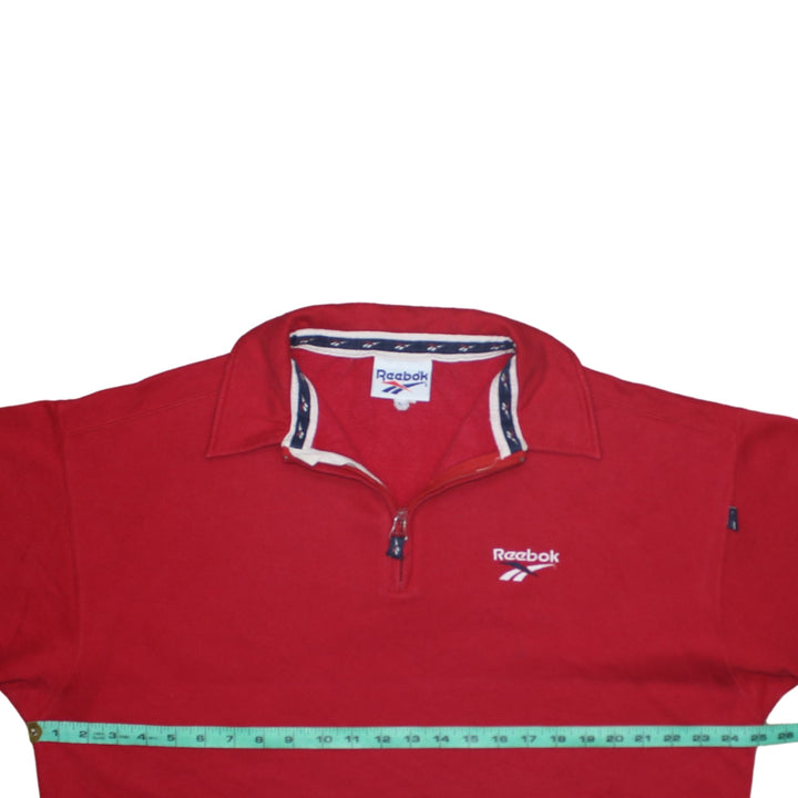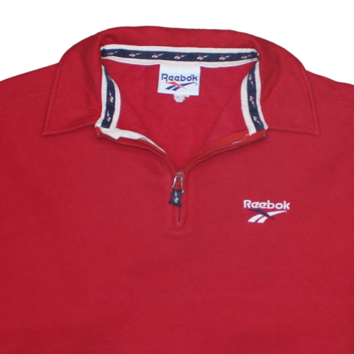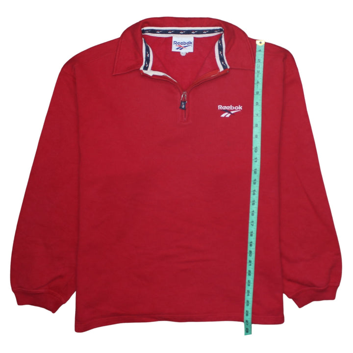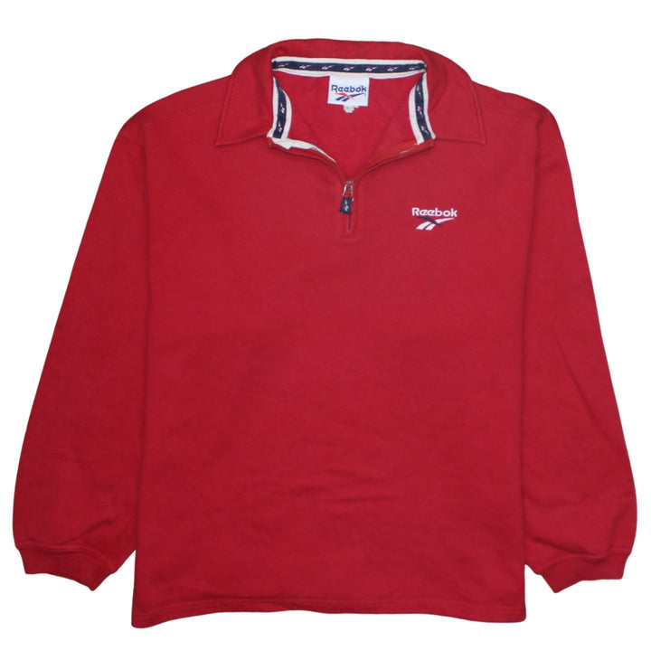 Reebok, Reebok sweatshirt, Reebok quarter zip, Reebok fleece, red Reebok top, red sweatshirt, red quarter zip, men's Reebok, men's sweatshirt, men's fleece, men's pullover, large sweatshirt, L sweatshirt, collared sweatshirt, quarter zip jumper, embroidered logo sweatshirt, sportswear top, athletic sweatshirt, casual jumper, casual fleece, long sleeve top, pullover top, relaxed fit sweatshirt, oversized fit jumper, classic Reebok logo, embroidered chest logo, 90s Reebok style, red fleece top, everyday sweatshirt, gym layer, training top, lounge wear top, casual wear, street style top, vintage Reebok sweatshirt, collectible Reebok, old school Reebok, red long sleeve, soft fleece fabric, nylon blend sweatshirt, men's casual clothing, men's sports top, comfortable pullover, wardrobe staple, layering piece, crew style jumper, half zip jumper, classic sports jumper