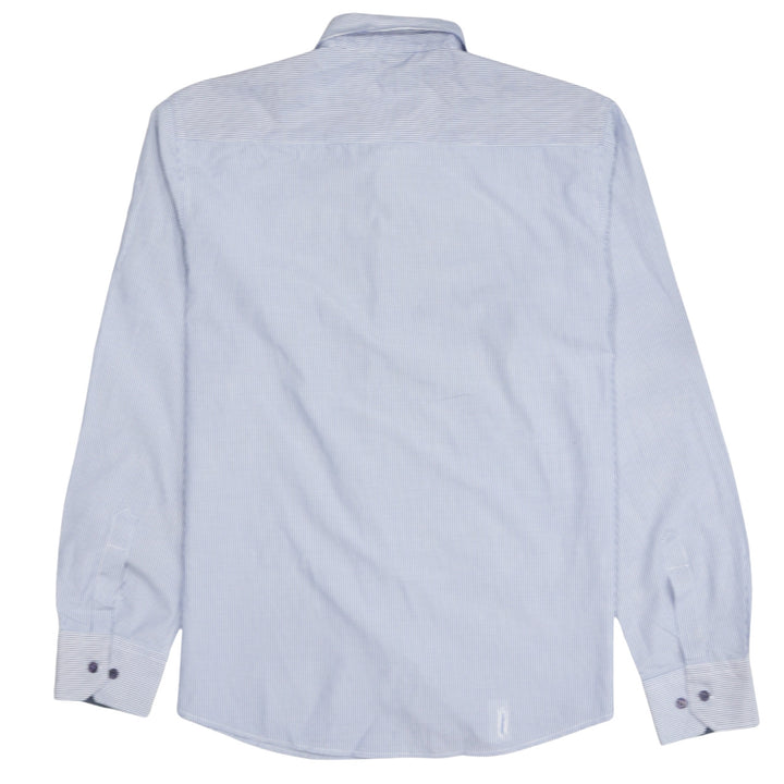 Key Features: Fine blue stripe pattern, button down collar, embroidered chest flag logo, double button cuffs