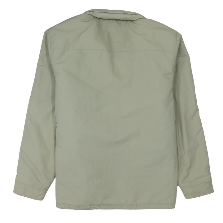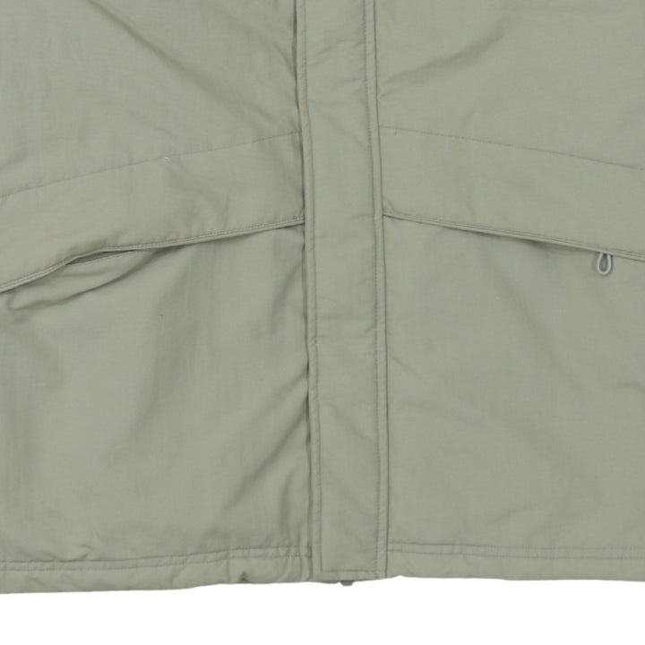 Key Features: High neck, full zip, sage green shell, front logo patch, multiple zip pockets