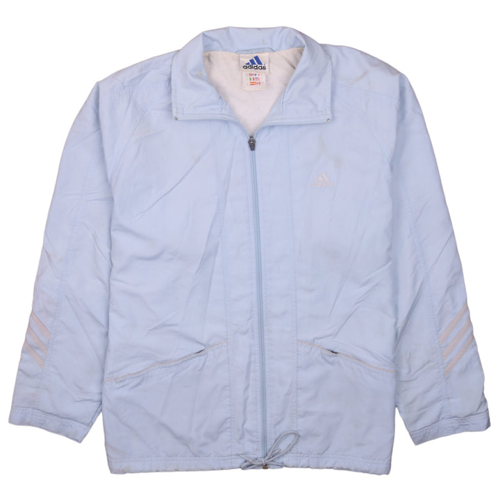 Key Features: Light blue shell, full zip front, three stripe sleeves, zip pockets, drawcord hem