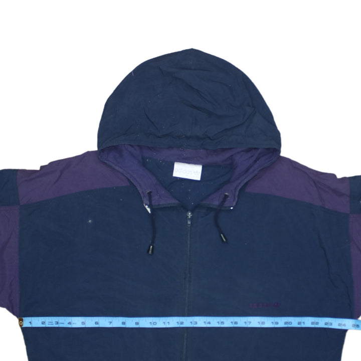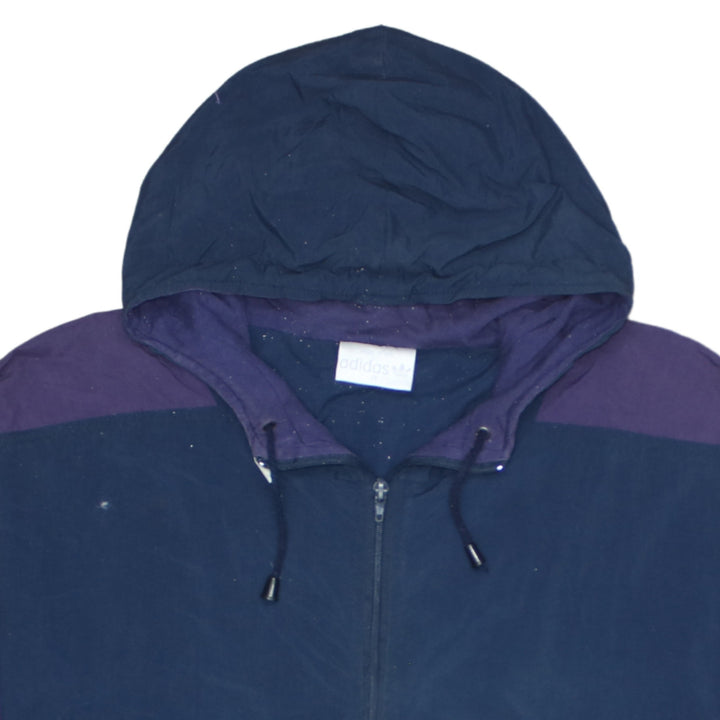 Adidas, Adidas jacket, Adidas hooded jacket, Adidas windbreaker, Adidas track jacket, Adidas Trefoil, Adidas embroidered logo, navy Adidas jacket, blue Adidas jacket, purple Adidas jacket, colour block jacket, men’s Adidas, men’s hooded jacket, men’s windbreaker, men’s track top, full zip jacket, full zip hooded jacket, casual jacket, sports jacket, outdoor jacket, lightweight jacket, polyester jacket, wool mix jacket, large Adidas jacket, L size jacket, relaxed fit jacket, oversized fit jacket, elasticated cuffs, drawstring hood, drawcord hem, vintage Adidas, classic Adidas, men’s outerwear, everyday jacket, casual wear, street casual jacket, layering piece, autumn jacket, spring jacket, festival jacket, hip hop style jacket, 90s Adidas style, navy blue outerwear, purple panel jacket, embroidered chest logo, Adidas sportswear, timeless design, wardrobe staple, second hand Adidas, pre-owned Adidas, sustainable fashion
