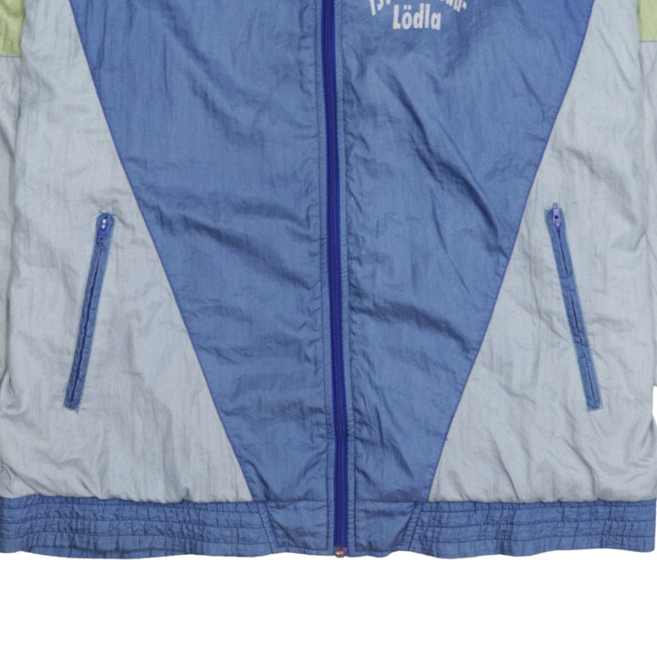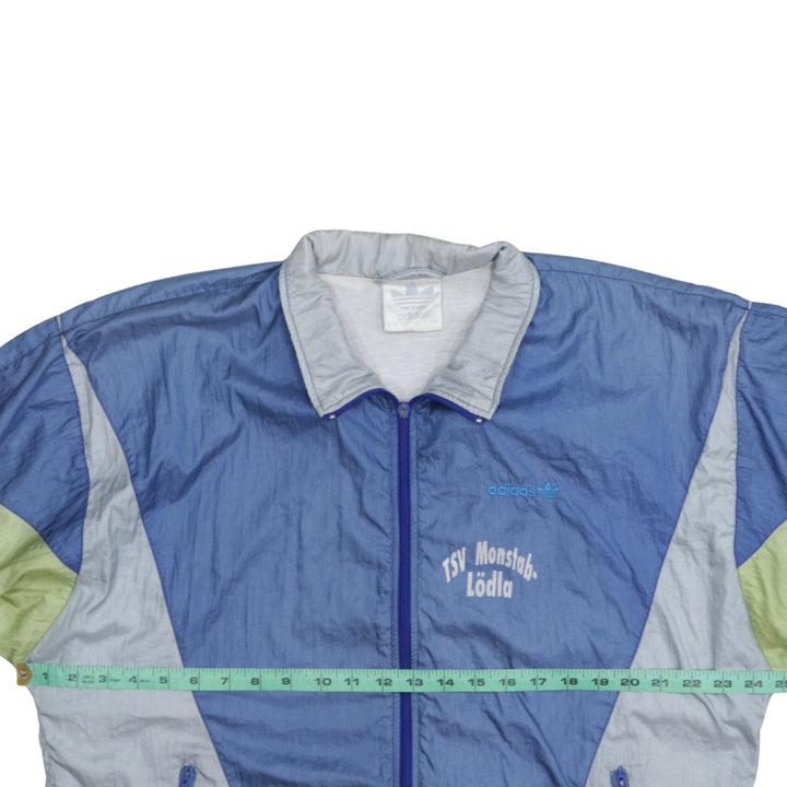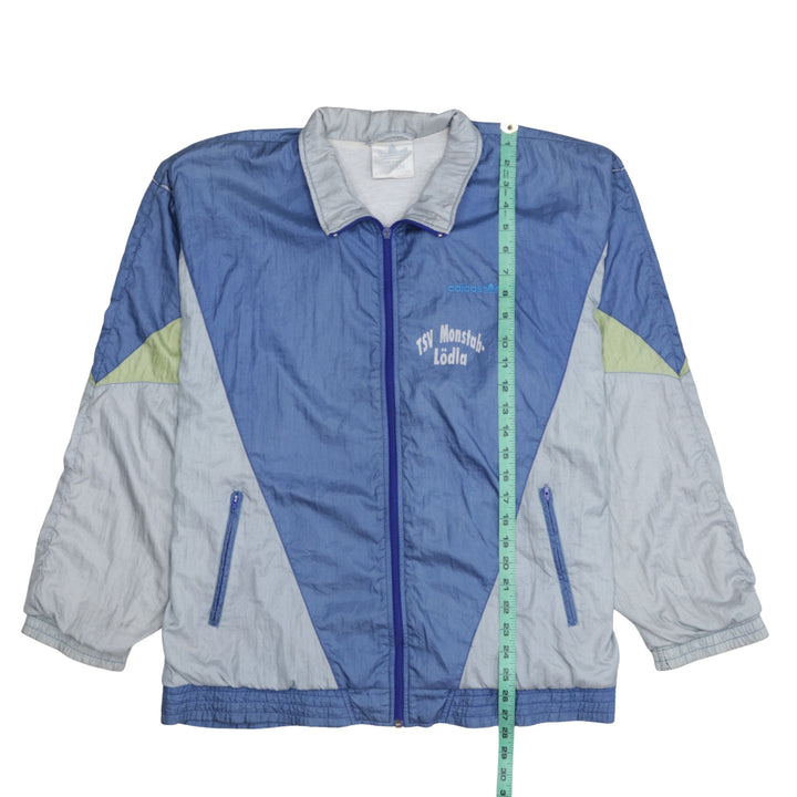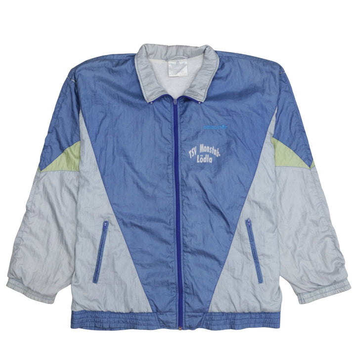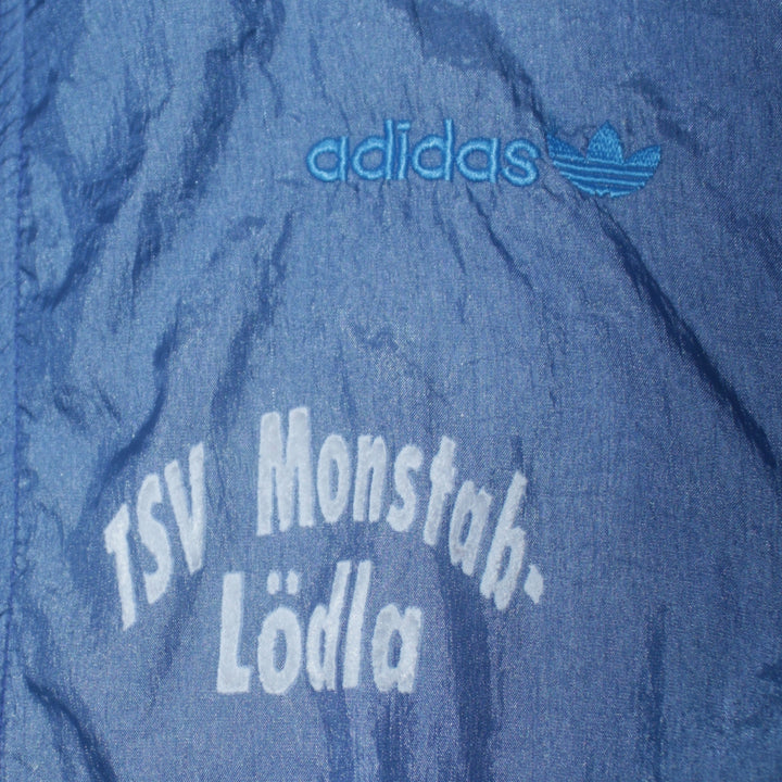 Adidas, Adidas jacket, Adidas windbreaker, Adidas track jacket, blue Adidas jacket, blue windbreaker, men's Adidas, men's windbreaker, men's track top, size medium jacket, nylon jacket, lightweight jacket, full zip jacket, full zip windbreaker, colour block jacket, embroidered logo, Trefoil logo, TSV Monstab-Lödla, Die Akademie print, German club jacket, training jacket, sports jacket, casual jacket, outerwear, long sleeve jacket, elasticated hem, elasticated cuffs, zip pockets, 90s Adidas style, classic Adidas, Adidas sportswear, men's outerwear, festival jacket, shell jacket, Adidas blue grey jacket, Adidas medium, relaxed fit jacket, oversized fit jacket, collectible Adidas, Adidas fan, everyday jacket, layering piece, casual wear, Athleisure jacket, Adidas track top blue, branded jacket, logo jacket, graphic back print jacket, vintage Adidas windbreaker