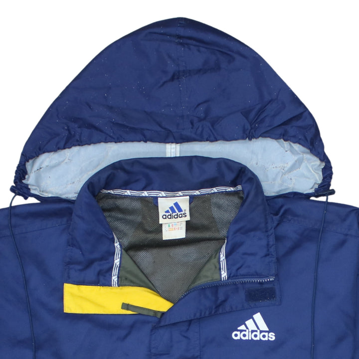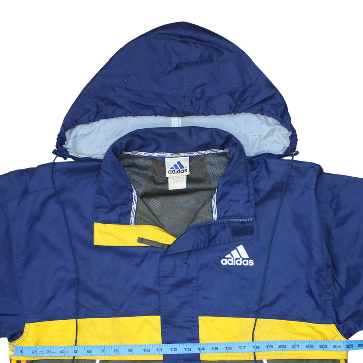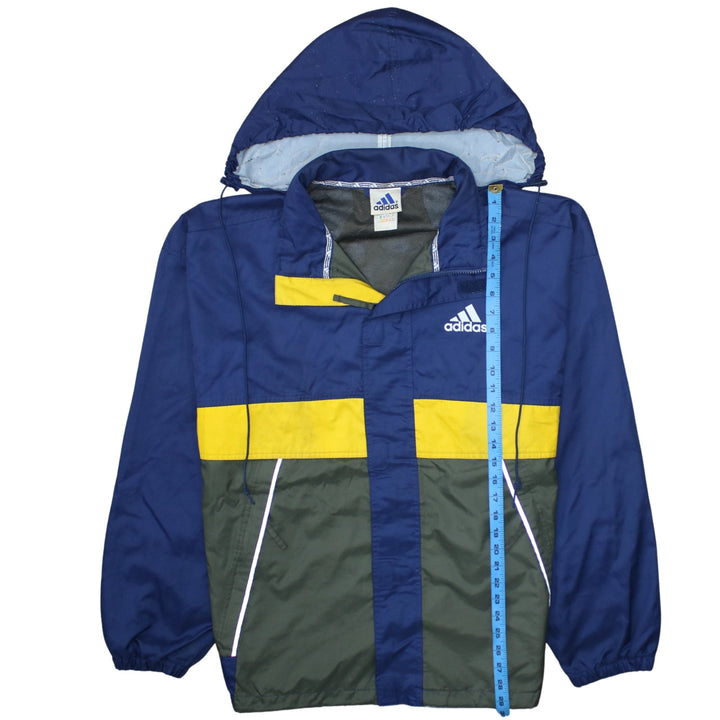 Adidas, Adidas jacket, Adidas windbreaker, Adidas track jacket, Adidas outerwear, navy Adidas jacket, blue yellow green jacket, colour block jacket, men's Adidas, men's windbreaker, men's track top, men's outerwear, hooded jacket, hooded windbreaker, full zip jacket, zip front jacket, mesh lining jacket, medium size jacket, men's medium, relaxed fit jacket, lightweight jacket, casual sports jacket, athletic jacket, colour block windbreaker, polyester jacket, zip pockets jacket, elasticated cuffs, drawstring hood, Adidas logo jacket, printed logo, everyday jacket, layering piece, casualwear, terrace wear, sportswear top, festival jacket, street jacket, outer shell jacket, breathable jacket, all season jacket, navy windbreaker, green panel jacket, yellow stripe jacket, Adidas pullover alternative, Adidas coat, men's casual coat, track style jacket, shell jacket, sportstyle outerwear