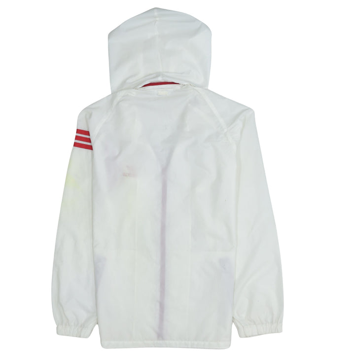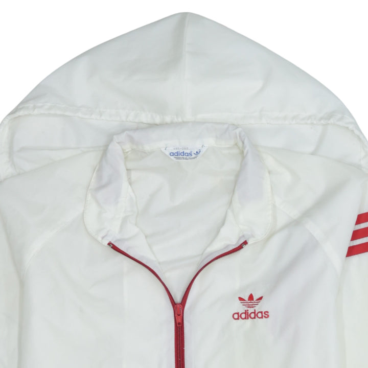 Adidas, Adidas jacket, Adidas windbreaker, Adidas hooded jacket, Adidas track jacket, Adidas outerwear, Adidas trefoil, trefoil logo, white Adidas jacket, white windbreaker, white hooded jacket, red zip jacket, red trefoil, three stripe sleeve, three stripe jacket, men's Adidas, men's jacket, men's windbreaker, men's track top, small size jacket, small men's Adidas, lightweight jacket, shell jacket, polyester jacket, casual jacket, sportswear jacket, training jacket, running jacket, athleisure jacket, hooded windbreaker, zip front jacket, zip pockets, long sleeve jacket, elasticated cuffs, elastic hem, ADS-200, Adidas Descente, classic Adidas style, archive Adidas, everyday wear, casual wear, layering piece, festival jacket, street casual jacket, gym cover up, track top, sports jacket, outerwear top