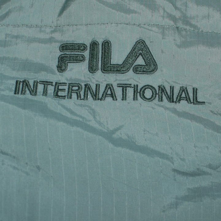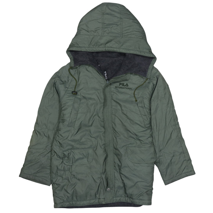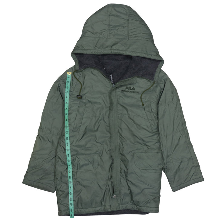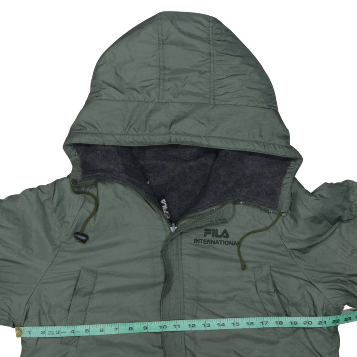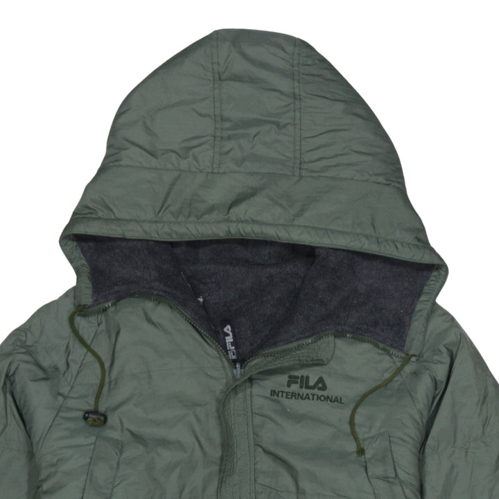 Fila jacket, Fila hooded jacket, Fila parka, Fila windbreaker, green Fila jacket, green hooded jacket, men's Fila coat, men's green jacket, men's hooded parka, medium Fila jacket, size M Fila, fleece lined jacket, quilted shell jacket, polyester wool jacket, casual outerwear, everyday coat, embroidered logo jacket, Fila International logo, longline jacket, relaxed fit jacket, oversized fit coat, drawstring hood coat, zip front jacket, snap storm flap, front pockets jacket, chest pocket jacket, winter jacket, autumn jacket, layering jacket, comfortable outerwear, durable coat, classic Fila style, men's outerwear, green parka, green outerwear, cosy fleece lining, warm men's coat, lightweight parka, nylon style shell, outdoor jacket, commuter jacket, street casual jacket, branded men's coat, thrift Fila jacket, second hand Fila jacket, pre-owned Fila coat, A grade condition jacket, collectible Fila outerwear, hooded outerwear