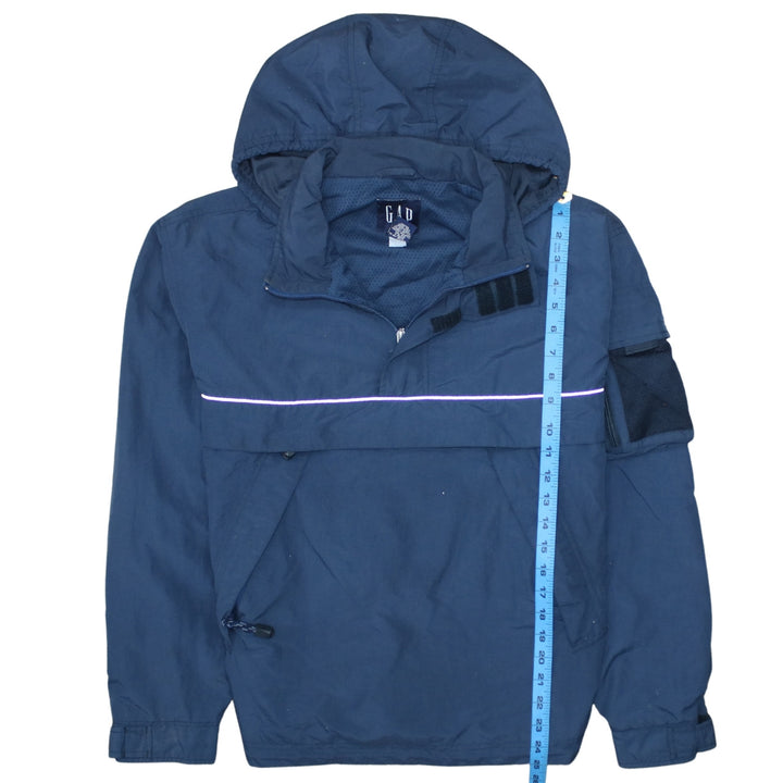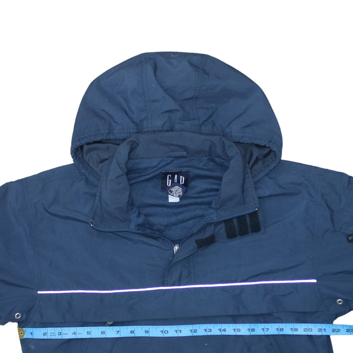 Gap windbreaker, Gap jacket, Gap hooded jacket, Gap anorak, navy blue windbreaker, navy blue jacket, men's windbreaker, men's hooded jacket, men's anorak, XSmall windbreaker, XS jacket, pullover jacket, half zip jacket, reflective strip jacket, reflective windbreaker, mesh lined jacket, mesh lining, arm pocket jacket, utility jacket, casual outerwear, lightweight jacket, spring jacket, autumn jacket, waterproof style jacket, Gap outerwear, navy pullover jacket, adjustable hem jacket, adjustable cuffs jacket, vintage Gap coat, classic Gap windbreaker, men's casual jacket, outdoor jacket, everyday jacket, festival jacket, breathable jacket, polyester cotton jacket, navy hooded coat, hooded anorak, men's small fit jacket, relaxed fit windbreaker, Gap blue coat, layering piece, second hand Gap jacket, pre-owned Gap windbreaker, reflective detail coat, pullover anorak, street jacket