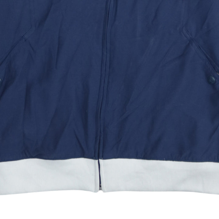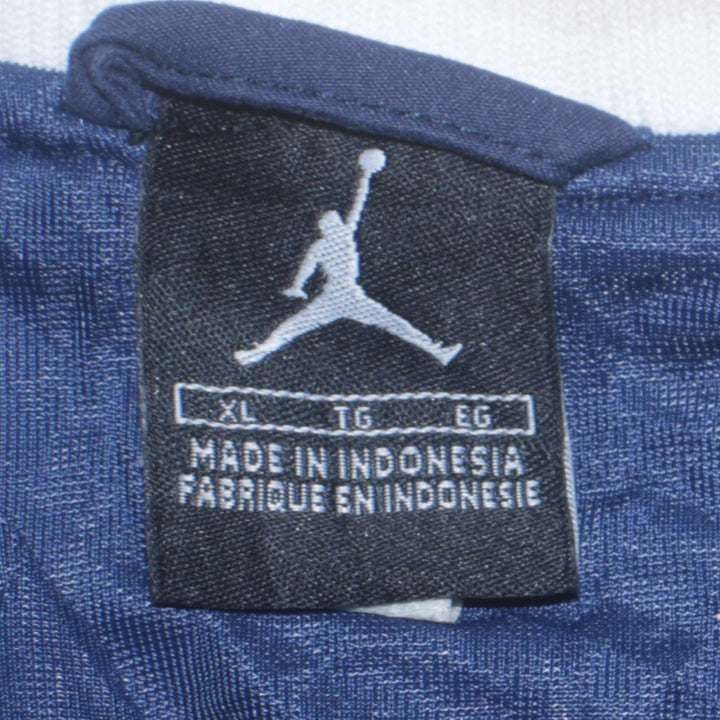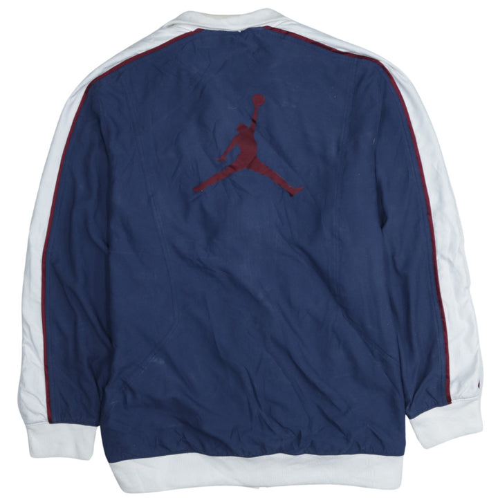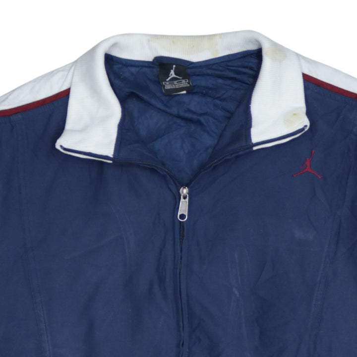 Jordan, Jordan jacket, Jordan windbreaker, Jordan track jacket, navy blue Jordan, navy windbreaker, men's Jordan jacket, men's windbreaker, men's track jacket, XLarge Jordan, XL Jordan jacket, XL windbreaker, embroidered Jumpman, Jumpman logo jacket, full zip jacket, zip front jacket, stand collar jacket, contrast panel jacket, white cuffs, red piping, basketball jacket, sports jacket, athletic jacket, outerwear, lightweight jacket, polyester jacket, wool blend jacket, casual jacket, training jacket, track top, navy blue track top, Jordan XL navy, Jordan Jumpman windbreaker, Jordan embroidered logo, classic Jordan jacket, men's sportswear, casual sports jacket, relaxed fit jacket, oversized fit jacket, street style jacket, layering piece, everyday outerwear, pre-owned Jordan, second hand Jordan, mark on front, Jordan collection, Jordan fan, blue and white jacket, navy red white jacket, zipped track top