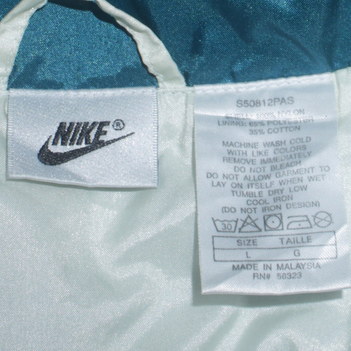 Nike, Nike jacket, Nike windbreaker, Nike track jacket, teal Nike jacket, purple Nike jacket, colour block jacket, colour block windbreaker, men's Nike jacket, men's Large Nike, L Nike jacket, full zip jacket, lightweight jacket, track top, shell jacket, nylon jacket, polyester jacket, cotton blend jacket, embroidered swoosh, swoosh logo, printed sleeve logo, logo sleeves, elasticated cuffs, elasticated hem, stand collar, 90s style Nike, casual outerwear, sportswear jacket, training jacket, athleisure jacket, vintage Nike jacket, Nike colour block, teal purple white jacket, men's outerwear, relaxed fit jacket, oversized fit jacket, retro sports jacket, street style jacket, Nike sports top, Nike shell top, festival jacket, layering piece, collectible Nike