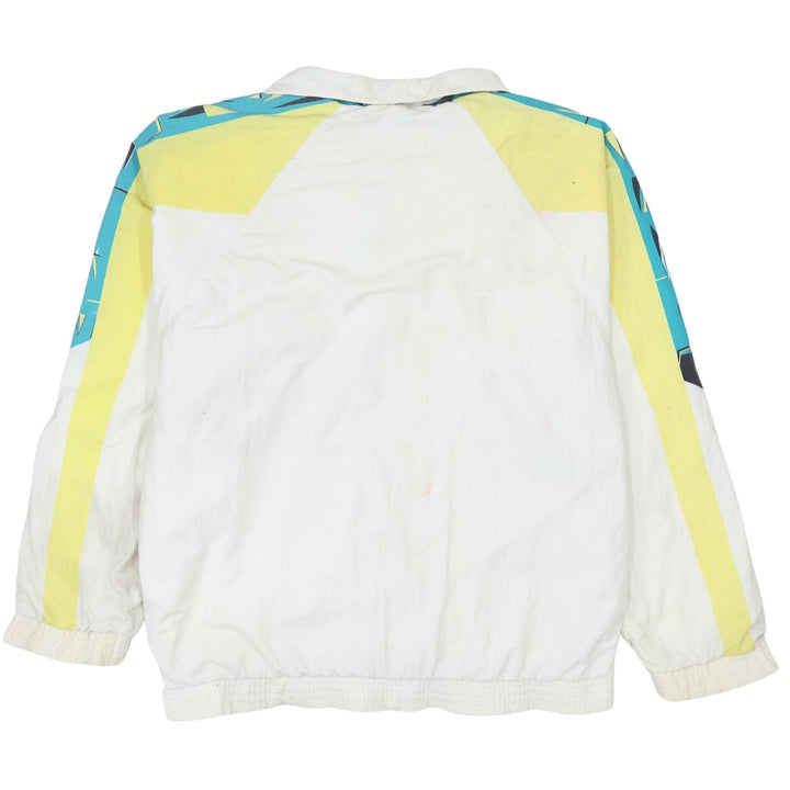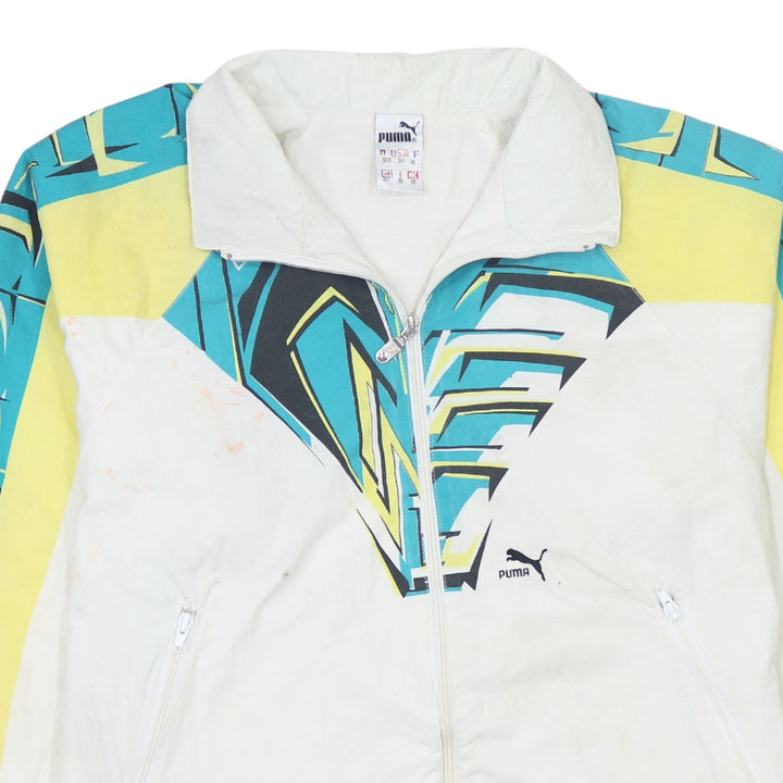 Puma, Puma jacket, Puma windbreaker, Puma track jacket, white Puma jacket, white windbreaker, teal yellow jacket, graphic sleeve jacket, men’s Puma, men’s windbreaker, men’s track top, large Puma jacket, size large jacket, full zip jacket, zip pockets jacket, elastic hem jacket, elastic cuffs jacket, stand collar jacket, casual outerwear, sportswear jacket, training jacket, lightweight jacket, polyester jacket, polyester blend jacket, colour block jacket, graphic print jacket, logo jacket, Puma logo, men’s outerwear, casual jacket, everyday jacket, festival jacket, street jacket, athleisure jacket, sports jacket, pullover alternative, layering piece, long sleeve jacket, 90s style Puma, classic Puma design, white teal yellow Puma, bold graphic Puma, track top, shell jacket, nylon style windbreaker, relaxed fit jacket, oversized look jacket, pre-owned Puma, second hand Puma, sustainable fashion, vintage Puma jacket