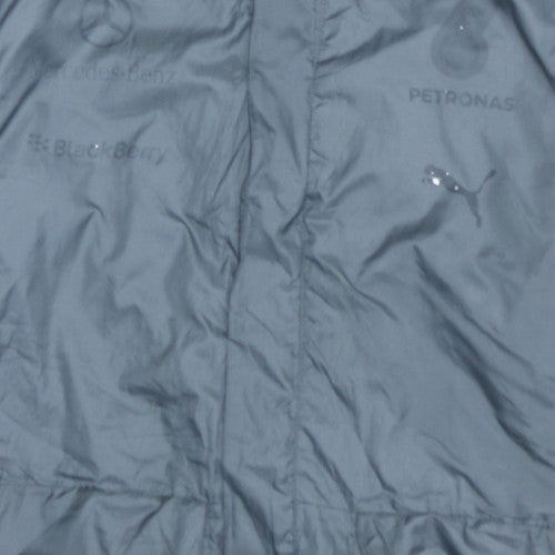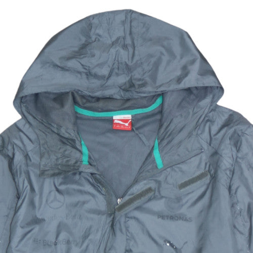 Puma Grey Hooded Windbreaker Jacket Men's Medium Petronas Printed Logo Zip Pockets Outerwear