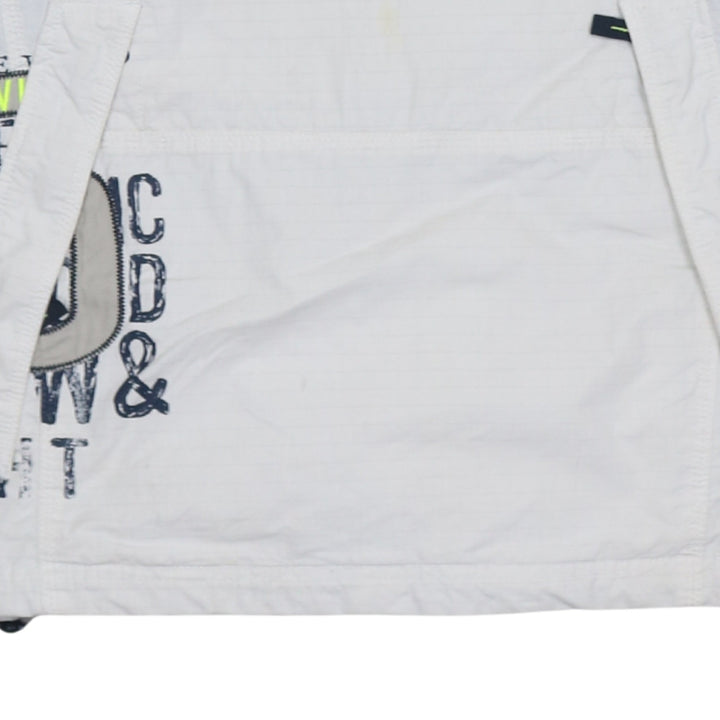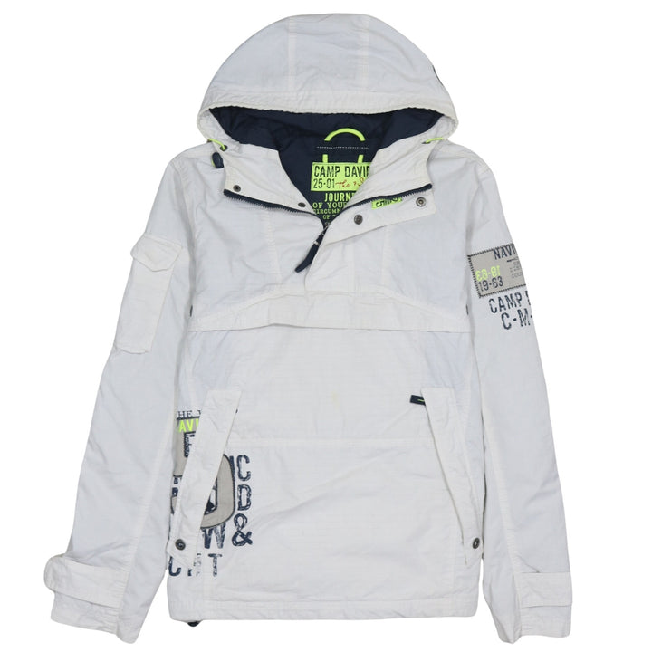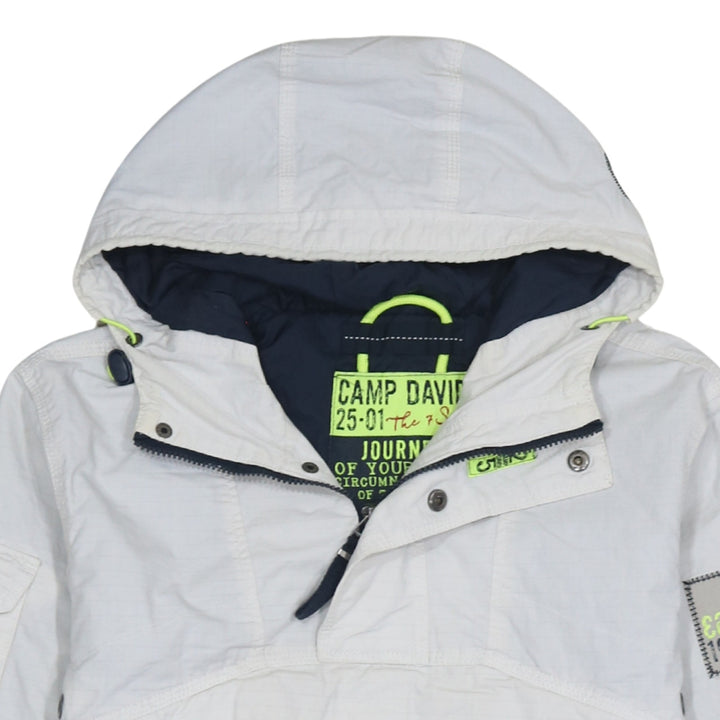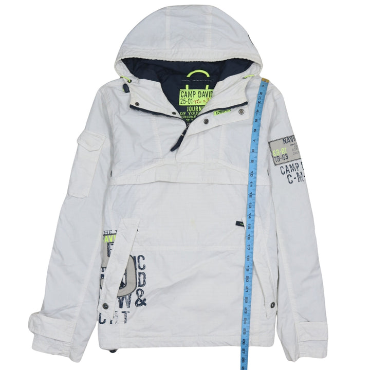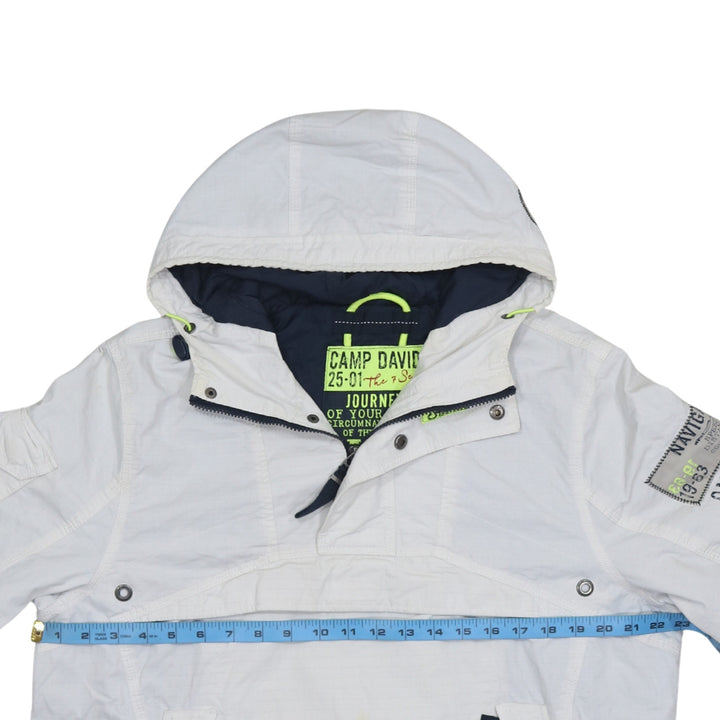 Camp David, Camp David jacket, Camp David windbreaker, Camp David anorak, white Camp David, white hooded jacket, men’s Camp David jacket, men’s white windbreaker, men’s hooded windbreaker, men’s anorak jacket, medium windbreaker, medium hooded jacket, nylon jacket, nylon windbreaker, pullover jacket, half zip jacket, lightweight jacket, lined jacket, graphic jacket, printed logo jacket, front pocket jacket, casual outerwear, everyday jacket, festival jacket, street jacket, sporty jacket, shell jacket, white nylon coat, men’s outerwear, relaxed fit jacket, medium chest 23 inch, length 26.5 inch, arm 20 inch, long sleeve jacket, hooded outerwear, spring jacket, summer jacket, autumn jacket, layering piece, pre-owned jacket, second hand jacket, tiny mark front, classic Camp David style, men’s fashion, casual wear, outdoor wear, sailing inspired jacket, logo hood, printed sleeve detail