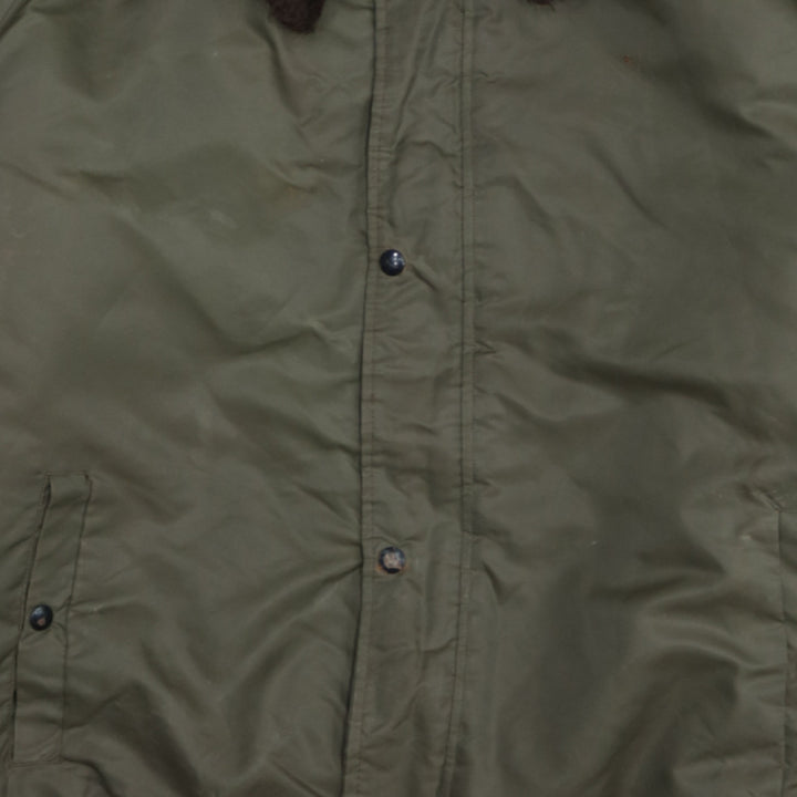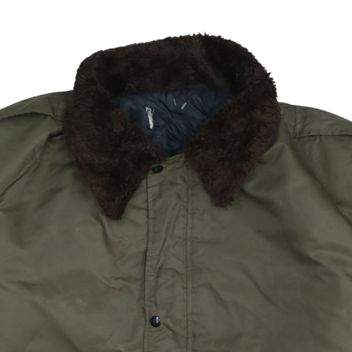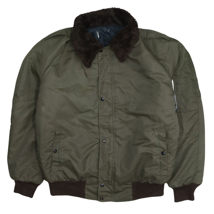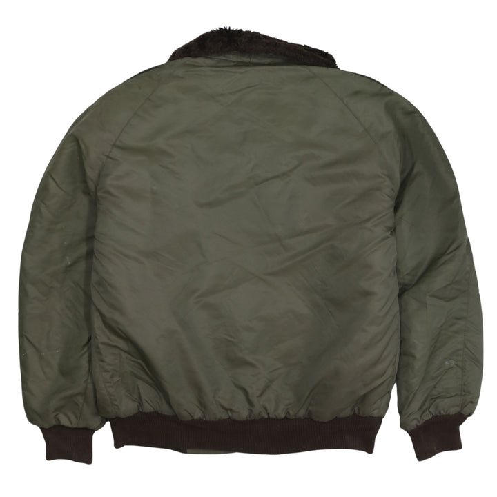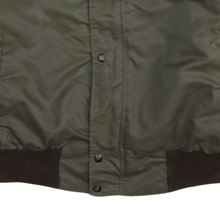 Retro Dark Khaki Jacket Men's XXLarge Faux Fur Collar Ribbed Hem Snap Front Bomber