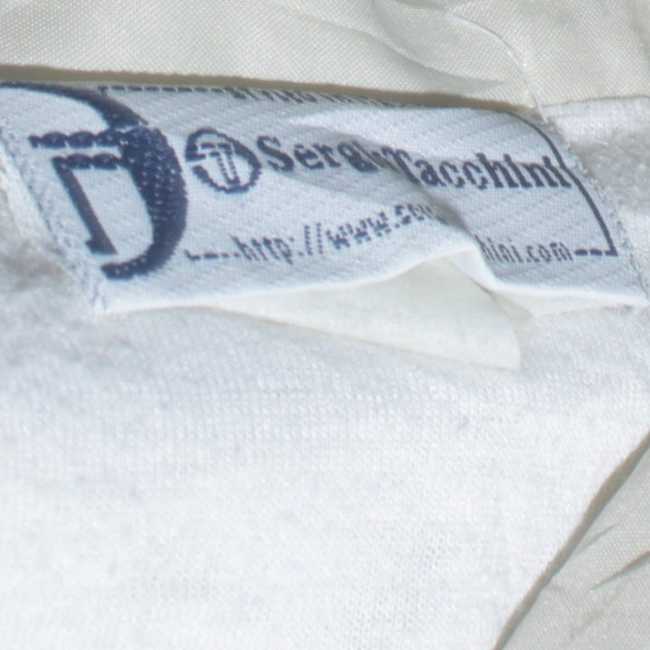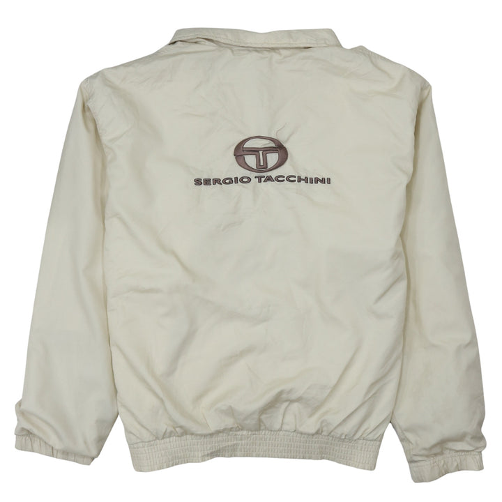 Sergio Tacchini, Sergio Tacchini jacket, Sergio Tacchini windbreaker, Sergio Tacchini track jacket, beige cream jacket, cream windbreaker, men's windbreaker, men's jacket, men's track top, full zip jacket, zip up jacket, lightweight jacket, polyester jacket, casual outerwear, sportswear jacket, tennis brand jacket, logo jacket, printed logo jacket, chest logo, back logo, elastic hem, elastic cuffs, stand collar jacket, size large jacket, L size jacket, relaxed fit jacket, oversized fit jacket, spring jacket, summer jacket, autumn jacket, everyday jacket, casual fashion, menswear, outer layer, cream track jacket, beige sports jacket, vintage Sergio Tacchini, classic windbreaker, neutral colour jacket, zip pockets jacket, street casual jacket, athletic style jacket, layering piece, second hand jacket, pre owned jacket, thrifted jacket, 90s style jacket