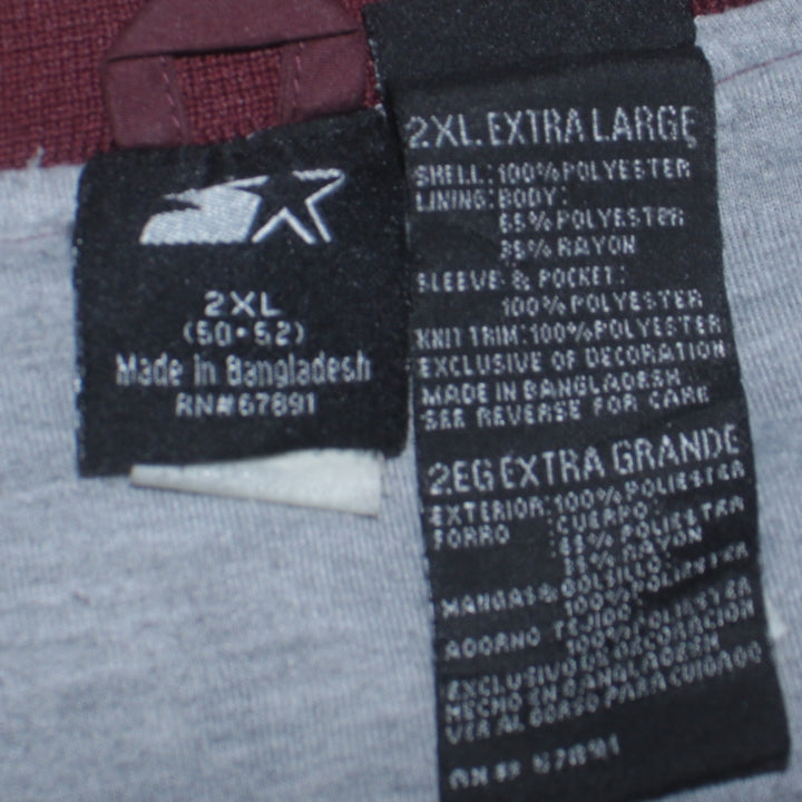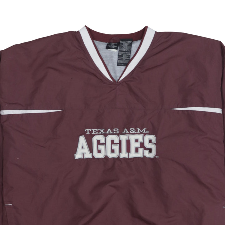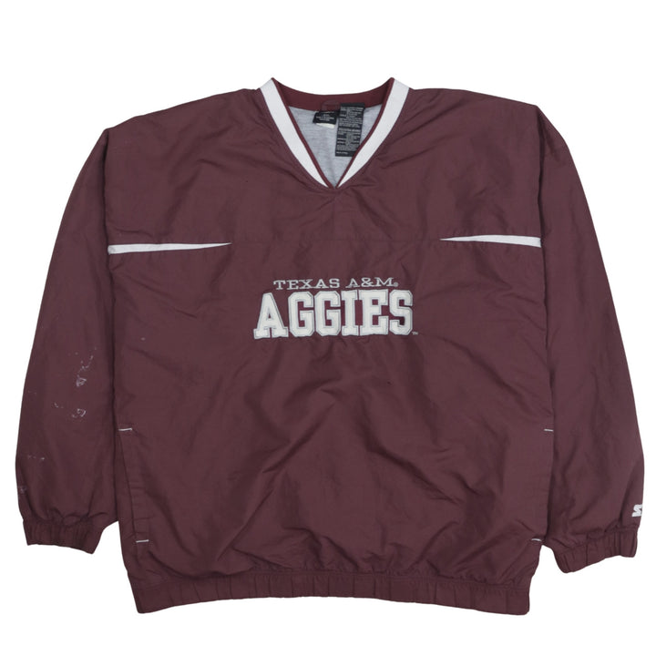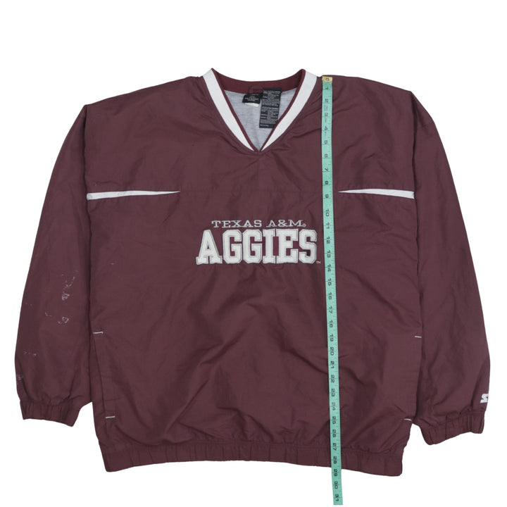 Starter, Texas A&M, Aggies, burgundy, red, windbreaker, pullover, jacket, men's, XXLarge, 2XL, embroidered logo, college jacket, NCAA, university, sportswear, casual jacket, outerwear, V-neck, elastic cuffs, elastic hem, lightweight, polyester, wool blend, lined jacket, fan gear, spellout logo, Texas A&M Aggies jacket, burgundy windbreaker, men's 2XL jacket, oversized fit, relaxed fit, long sleeve, Starter windbreaker, Starter Aggies, maroon jacket, pullover top, training jacket, casual top, athletic style, embroidered chest logo, back logo, fan apparel, supporter gear, everyday wear, layering piece, seasonal jacket, US college team, maroon windbreaker, Starter sports jacket