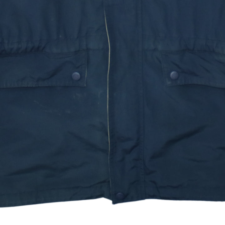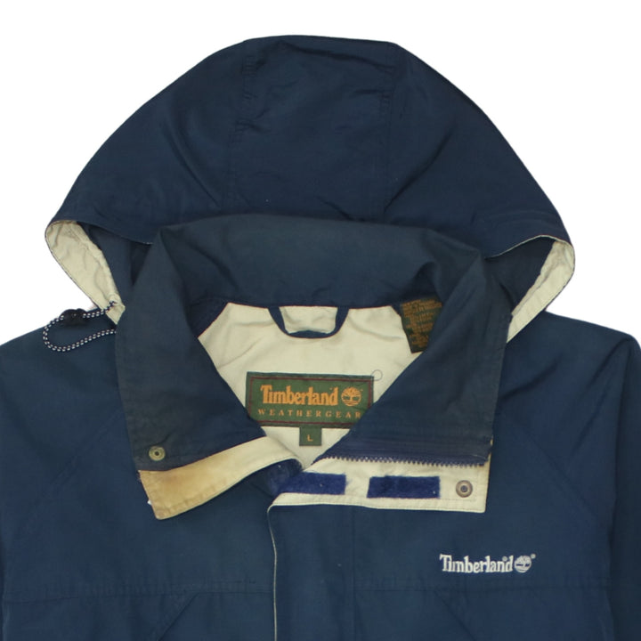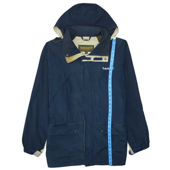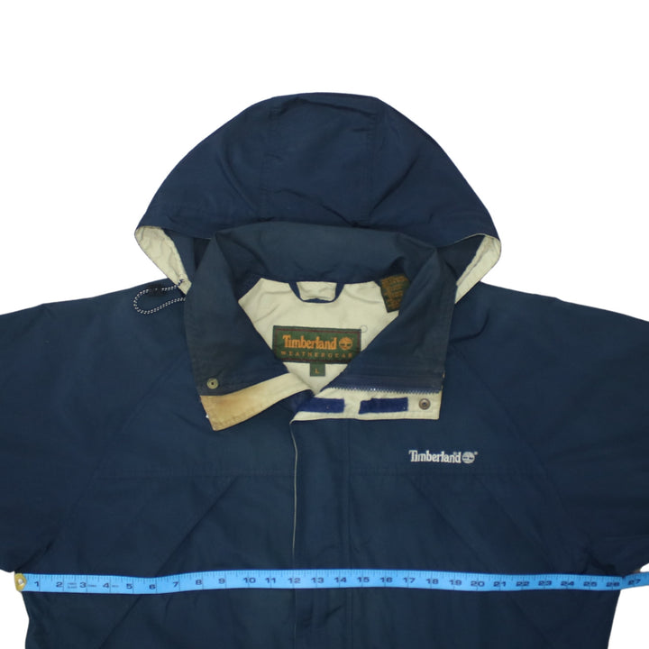 Timberland jacket, Timberland hooded jacket, Timberland windbreaker, Timberland coat, navy blue Timberland, navy hooded jacket, men's Timberland large, men's large jacket, full zip jacket, zip front coat, hooded windbreaker, outdoor jacket, casual jacket, everyday coat, embroidered logo jacket, logo windbreaker, cotton nylon shell, nylon lining, navy blue outerwear, longline jacket, elasticated cuffs, drawcord hood, flap pockets, utility jacket, hiking jacket, walking jacket, camping jacket, trail jacket, waterproof style jacket, classic Timberland style, men's navy coat, men's outerwear, lightweight jacket, spring jacket, autumn jacket, festival jacket, street jacket, relaxed fit jacket, oversized fit coat, 26 pit to pit jacket, 31 length jacket, Timberland Weathergear, vintage Timberland jacket, second hand Timberland, pre-owned Timberland coat, sustainable fashion, recycled clothing, blue hooded coat, zip pockets jacket