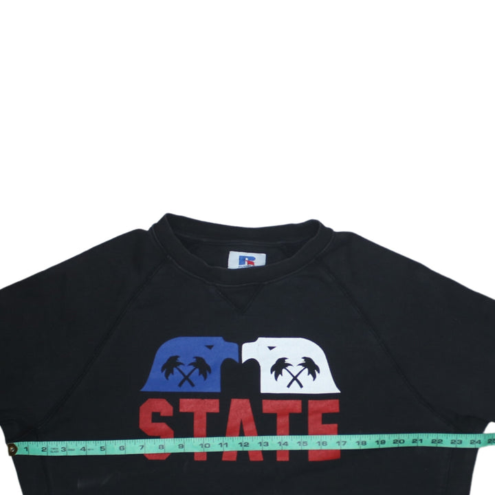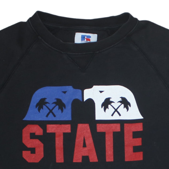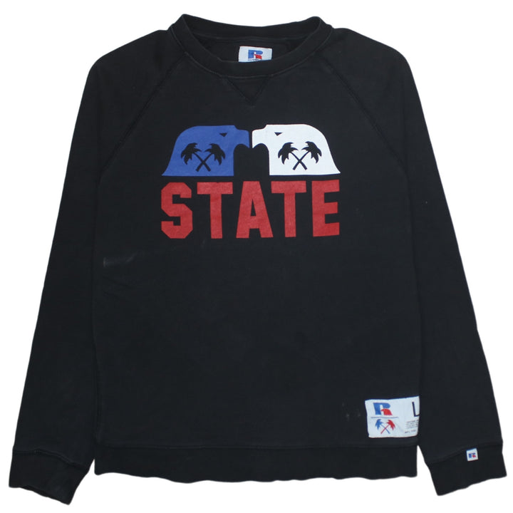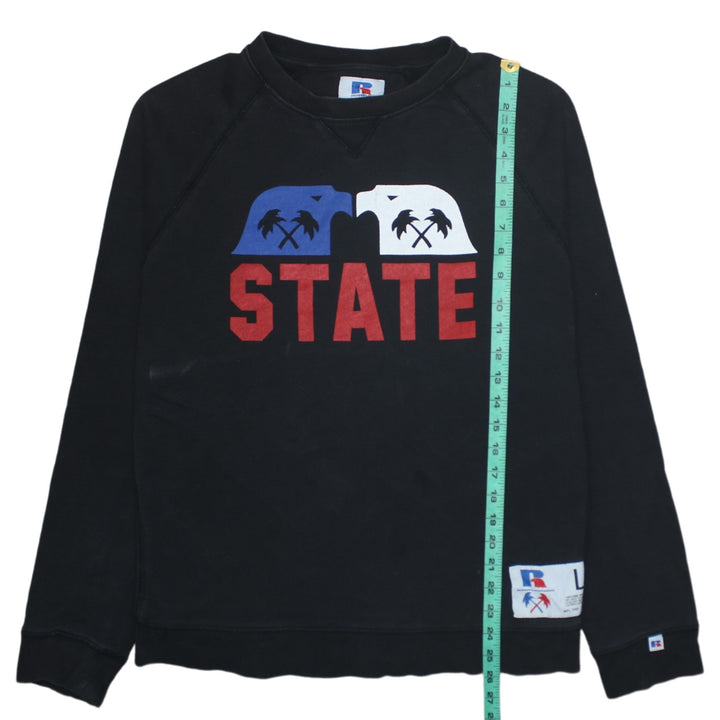 Russell Athletic sweatshirt, Russell Athletic crewneck, Russell Athletic black sweatshirt, black crewneck sweatshirt, men's large sweatshirt, mens L sweatshirt, printed logo sweatshirt, STATE logo jumper, palm tree graphic top, raglan sleeve sweatshirt, ribbed cuffs sweatshirt, ribbed hem sweatshirt, casual pullover, fleece top, loungewear top, athletic sweatshirt, graphic sweatshirt, black pullover, mens casual jumper, comfy sweatshirt, everyday sweatshirt, classic crew neck, logo patch hem, 90s style Russell, black Russell crew, college style sweatshirt, university style jumper, street casual top, soft cotton blend sweatshirt, relaxed fit sweatshirt, oversized look sweatshirt, layering piece, winter layering top, autumn sweatshirt, spring pullover, sportswear sweatshirt, vintage Russell Athletic, pre owned Russell sweatshirt, second hand Russell jumper, men's casual wear, black graphic sweater, long sleeve top, crew neck fleece, statement print sweatshirt