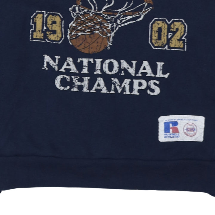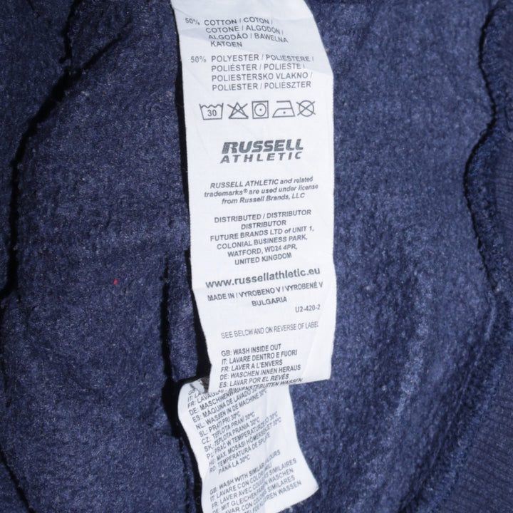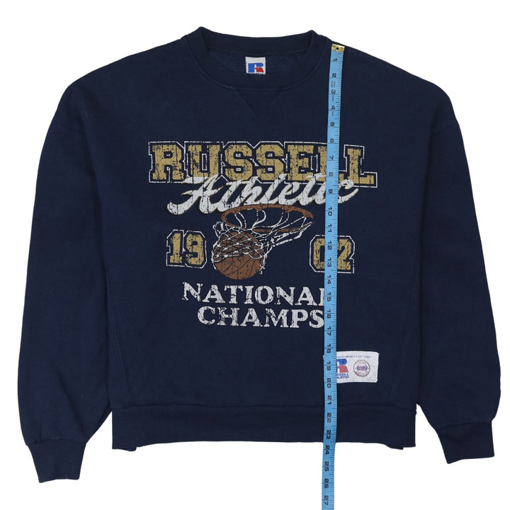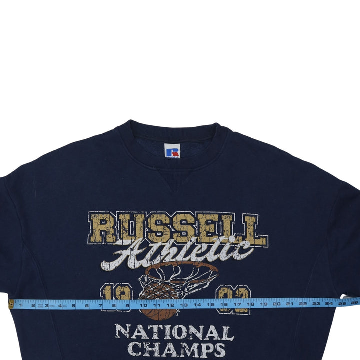 Russell Athletic, Russell Athletic sweatshirt, navy sweatshirt, navy blue crewneck, men’s XSmall sweatshirt, XS sweatshirt, crewneck fleece, pullover sweatshirt, basketball print jumper, National Champs print, college style jumper, collegiate sweatshirt, sports graphic top, cotton polyester fleece, cosy fleece lining, ribbed cuffs, ribbed hem, ribbed crew neck, casual pullover, men’s casual top, loungewear top, athletic wear, sportswear jumper, graphic sweatshirt, navy blue pullover, classic logo sweatshirt, Russell logo patch, small size men’s, oversized fit sweatshirt, unisex sweatshirt XS, embroidered sleeve logo, printed chest graphic, winter layer, autumn layer, everyday sweatshirt, staple sweatshirt, second hand Russell Athletic, pre-owned sweatshirt, A grade condition, thrifted jumper, basketball fan clothing, street casual top, soft fleece sweater, warm crewneck, logo sweatshirt men’s
