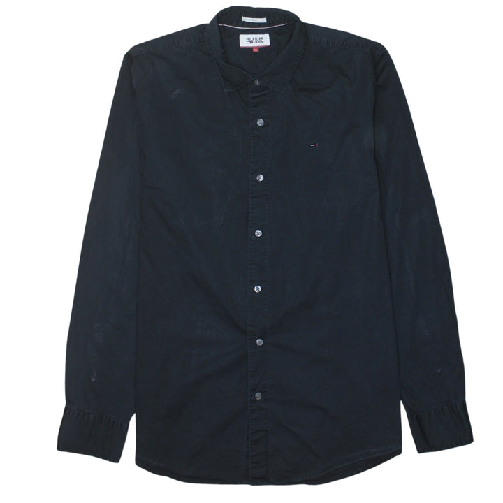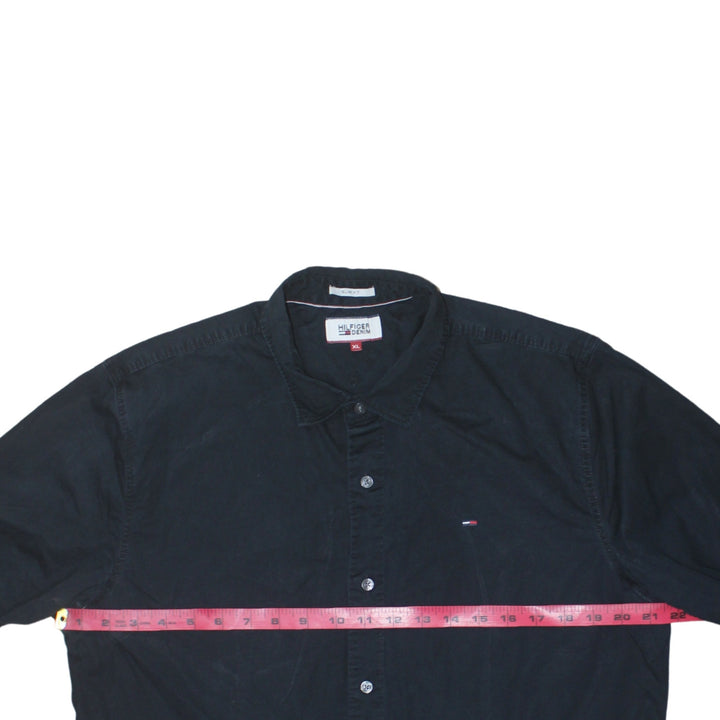 Tommy Hilfiger, Tommy Hilfiger shirt, black shirt, men's black shirt, men's XLarge shirt, XL shirt, long sleeve shirt, button up shirt, button front shirt, casual shirt, smart casual shirt, cotton shirt, embroidered logo shirt, flag logo shirt, designer shirt, classic collar shirt, collared shirt, black cotton shirt, menswear, men's top, everyday shirt, work shirt, going out shirt, minimal logo shirt, slim fit look shirt, relaxed fit shirt, wardrobe essential, staple shirt, Tommy Hilfiger menswear, XLarge black shirt, long sleeve cotton shirt, casual wear, smart wear, layering piece, classic black shirt, A grade condition, second hand shirt, pre-owned designer shirt, sustainable fashion, resale clothing, chest 22 inches, length 29 inches, arm 21 inches, button cuff shirt, plain black shirt, understated logo shirt