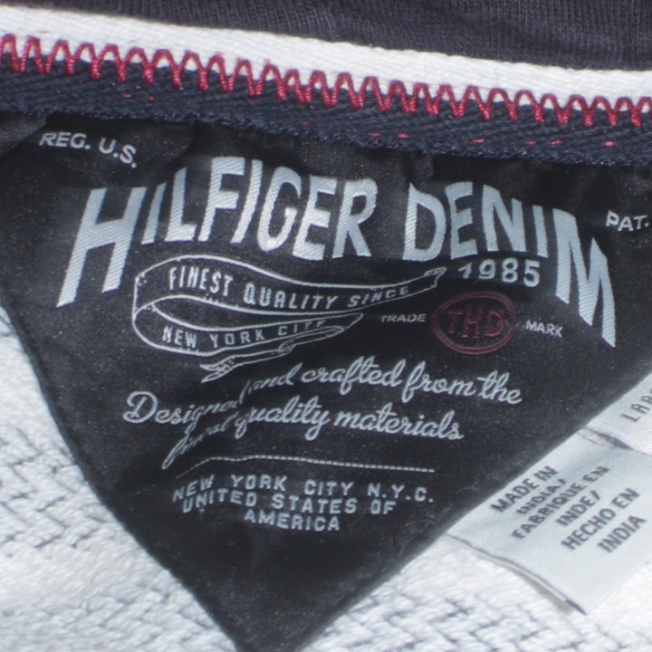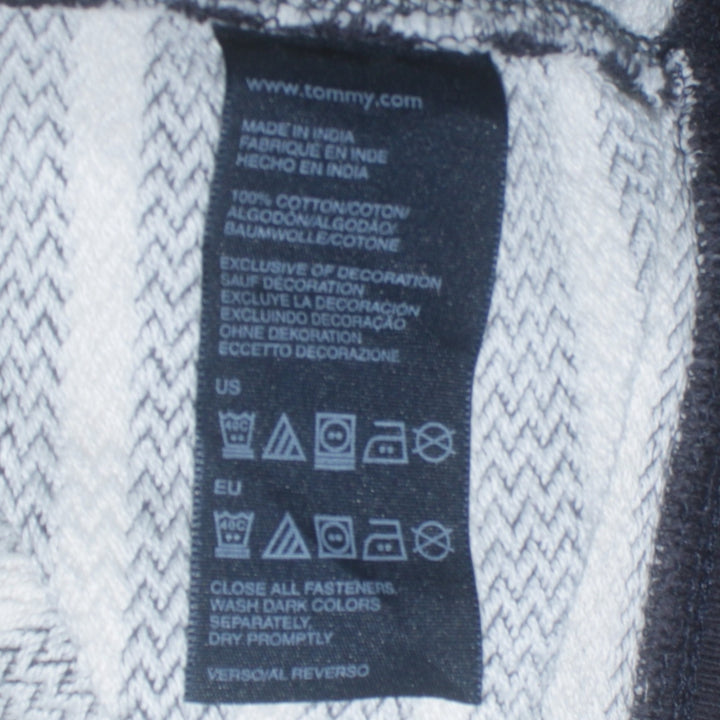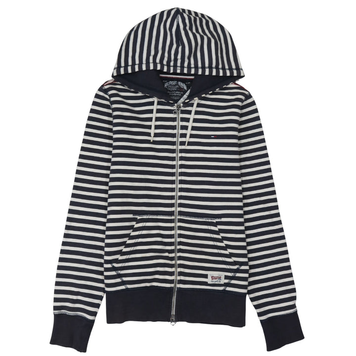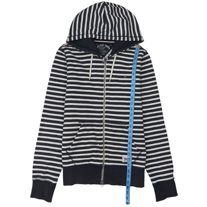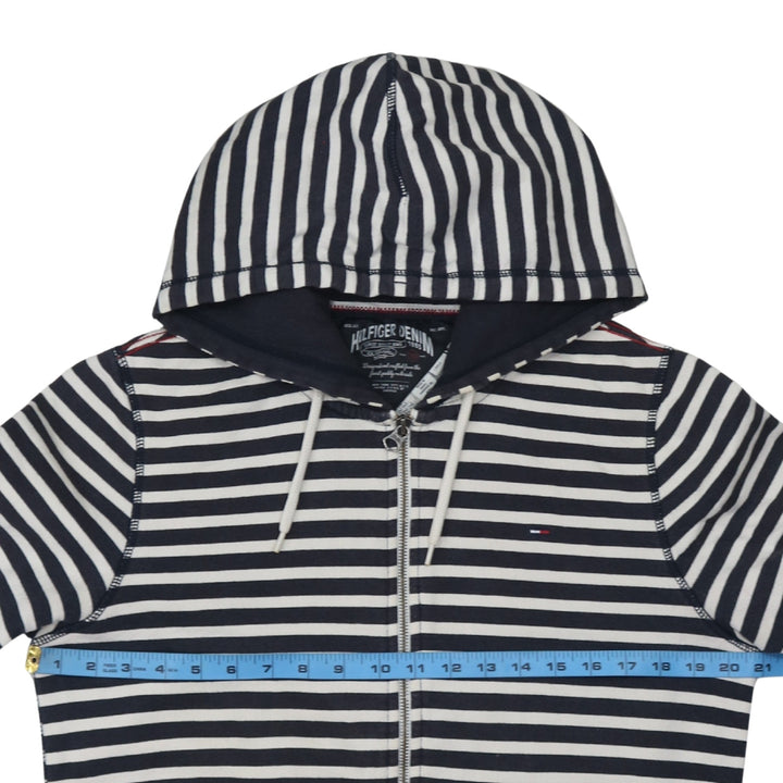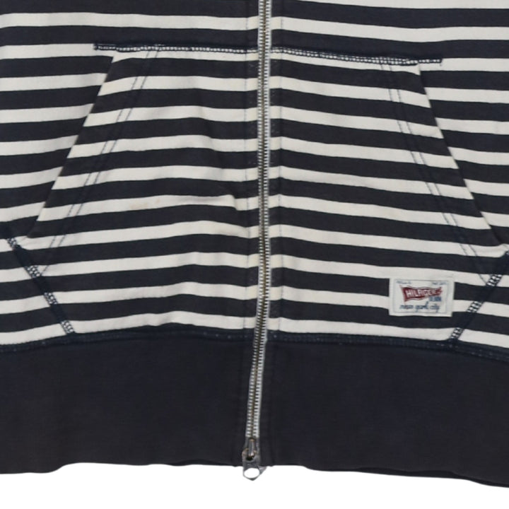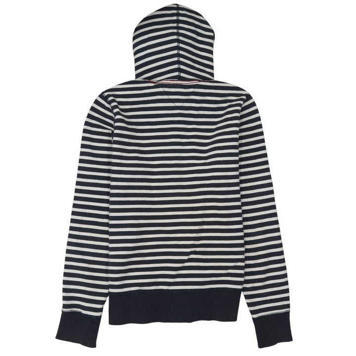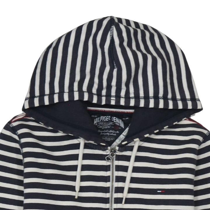 Tommy Hilfiger Navy Stripe Hoodie Women’s Large Zip Front Drawstring Flag Logo Sweatshirt