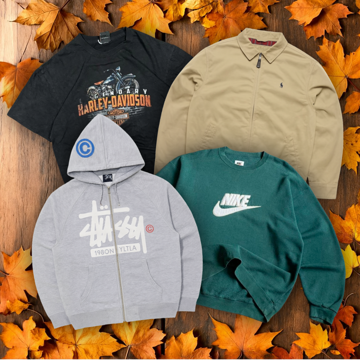 Expect a warm rotation of heavy Vintage Sweatshirts, T-shirts, Jackets, Fleeces, and layering essentials perfect for the colder months. We pack these boxes with the heavy hitters, including Carhartt, The North Face, Nike, Dickies, Adidas, Ralph Lauren, Burberry, and more.
