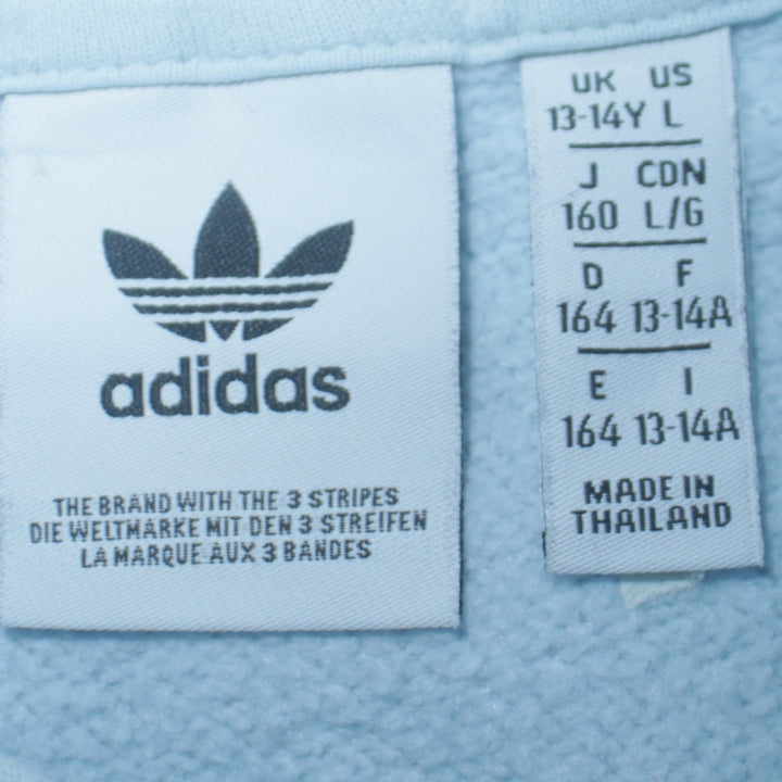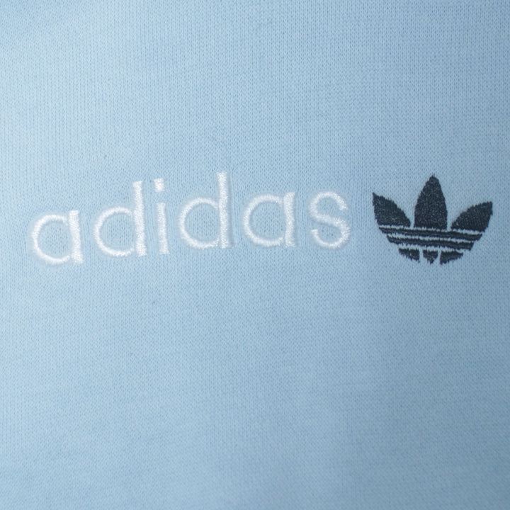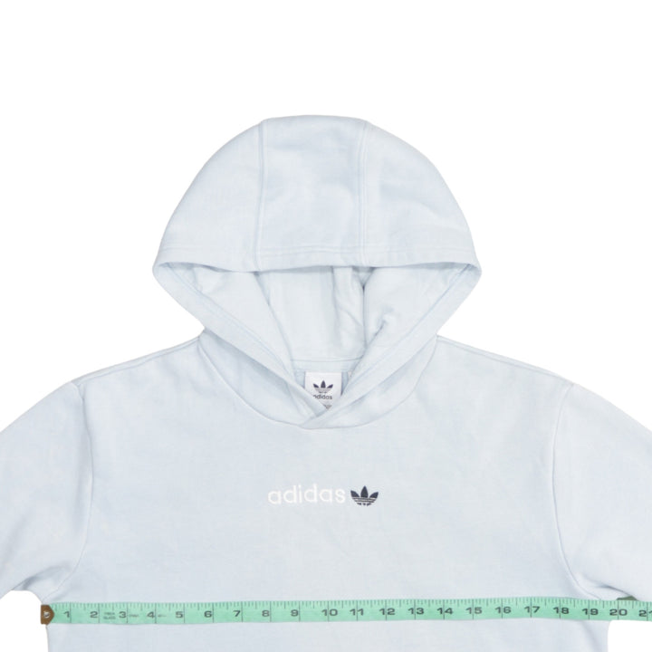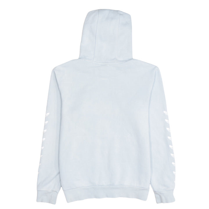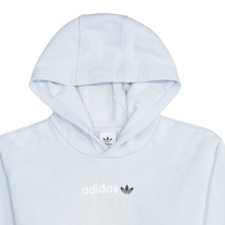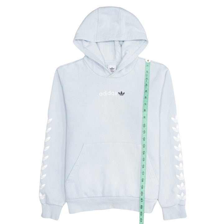 Adidas Light Blue Hoodie Women’s Large Embroidered Trefoil Logo Sleeve Print Pullover Sweatshirt