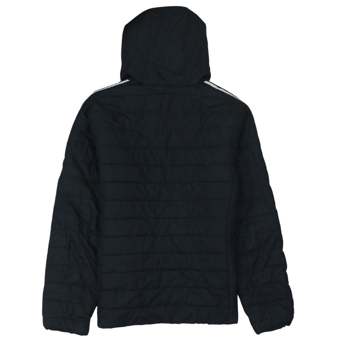 Adidas Black Hooded Puffer Jacket Women's Large Trefoil Logo Three Stripe Sleeves Outerwear
