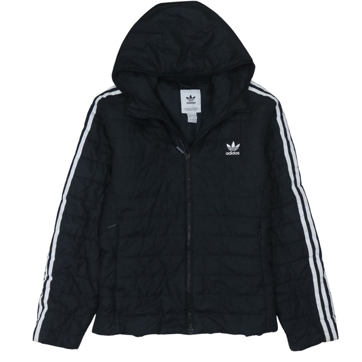 Key Features: Quilted padded shell, hooded design, Trefoil chest logo, three stripe sleeves, zip pockets