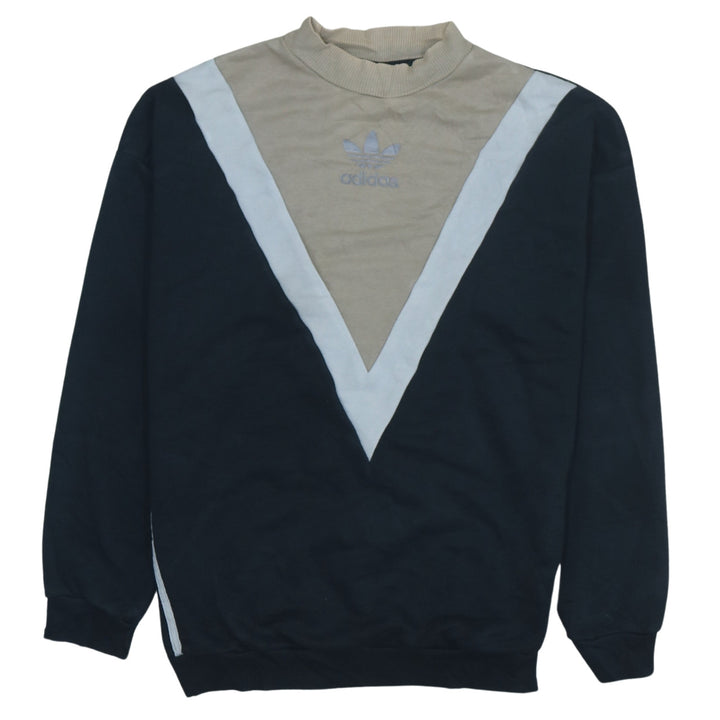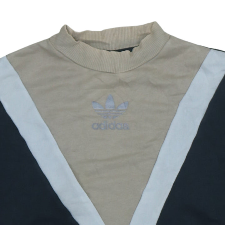 Adidas, Adidas Originals, Adidas sweatshirt, Adidas jumper, Adidas pullover, navy Adidas sweatshirt, cream panel sweatshirt, V panel sweatshirt, Trefoil logo, embroidered Trefoil, women's Adidas, women's sweatshirt, women's small, size S, relaxed fit, oversized fit, crewneck sweatshirt, mock neck sweatshirt, long sleeve top, sportswear top, casual sweatshirt, fleece top, loungewear, athleisure, navy blue, cream, beige, colour block, contrast panel, ribbed cuffs, ribbed hem, ribbed neck, classic Adidas, Adidas top, Adidas clothing, Adidas womenswear, casual wear, everyday sweatshirt, embroidered logo sweatshirt, 25 inch pit to pit, 28 inch length, 22 inch sleeve, A grade condition, pre-owned Adidas, second hand Adidas, pullover top, cosy jumper, layering piece, wardrobe staple