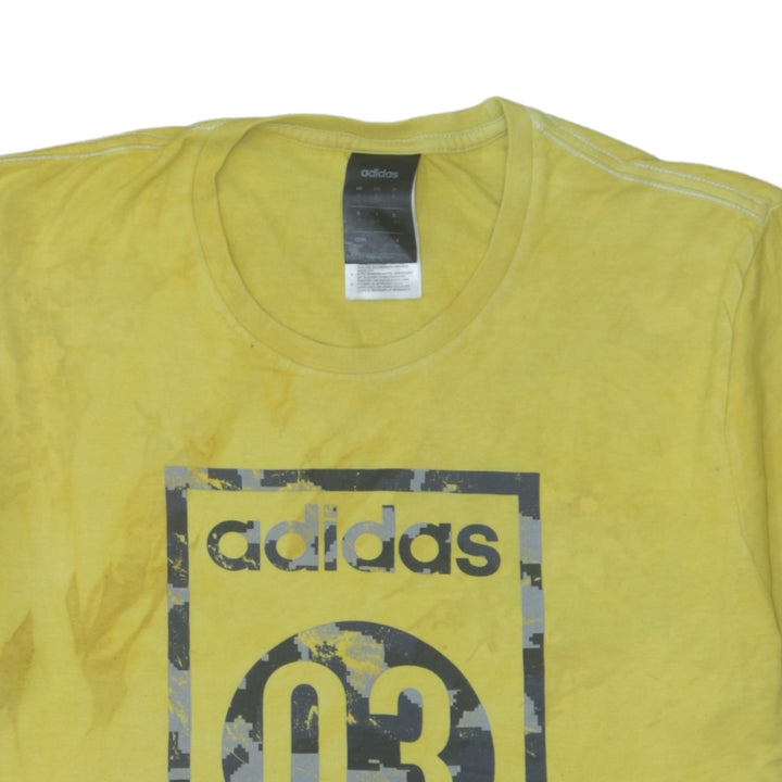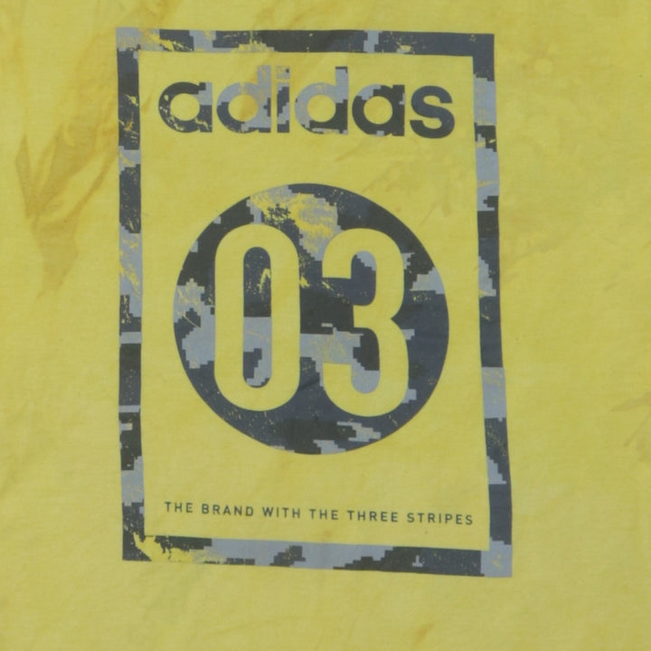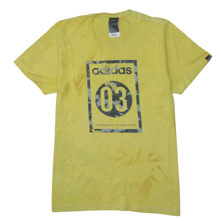 Key Features: Bold front Adidas 03 print, soft yellow cotton, subtle tie-dye effect, short sleeves