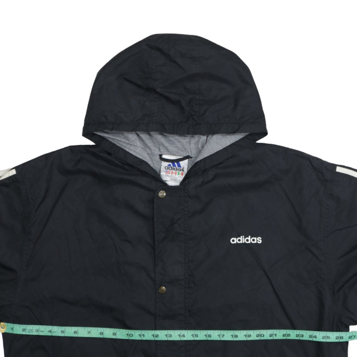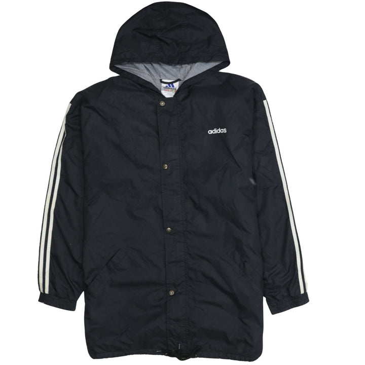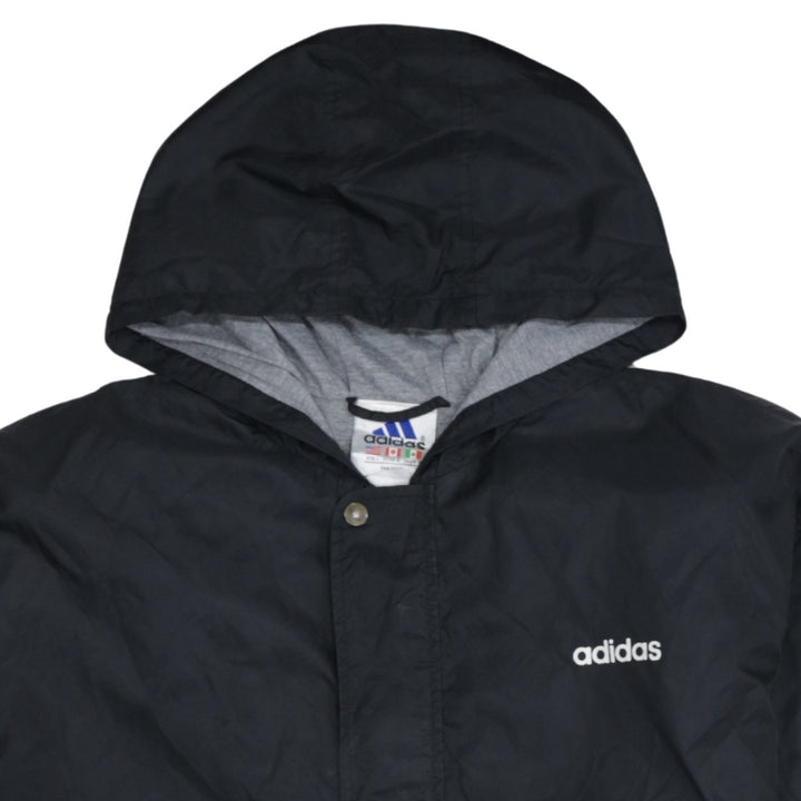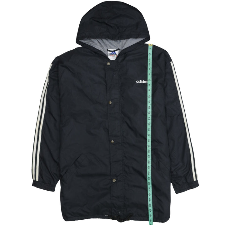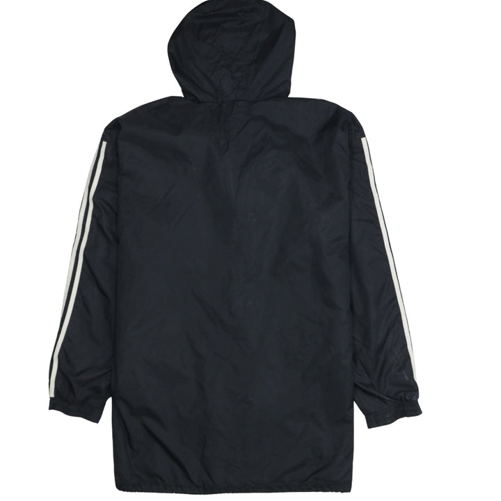 Adidas, Adidas jacket, Adidas windbreaker, Adidas hooded jacket, Adidas coat, black Adidas jacket, black hooded windbreaker, men's Adidas jacket, men's black coat, men's large jacket, Adidas three stripe sleeves, longline jacket, hooded track jacket, casual outerwear, lightweight coat, polyester jacket, wool blend lining, snap button jacket, zip front jacket, track top, sportswear jacket, casual sports coat, shell jacket, lined windbreaker, black hooded coat, Adidas logo jacket, printed logo jacket, oversized fit jacket, relaxed fit coat, everyday outerwear, festival jacket, commuter jacket, layering piece, spring jacket, autumn jacket, winter layering, men's casual jacket, street casual coat, black sports jacket, athletic outerwear, Adidas long coat, hooded track coat, three stripe arm detail, classic Adidas style, pre-owned Adidas, A grade Adidas, quality Adidas outerwear, men's tops, men's outerwear, men's sportswear, large size jacket