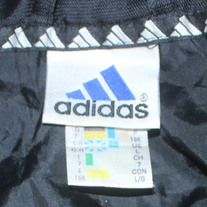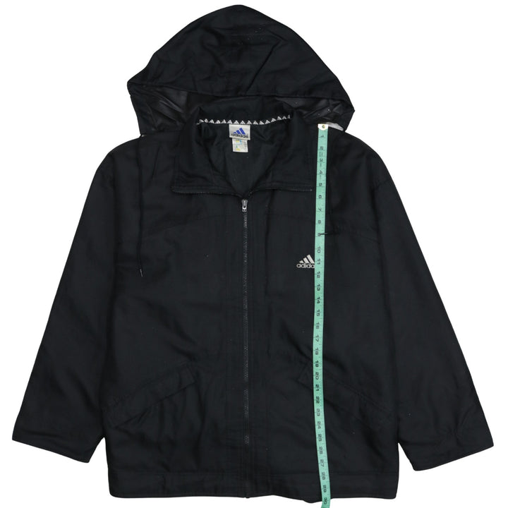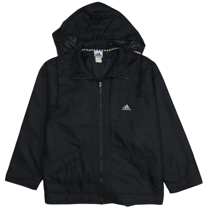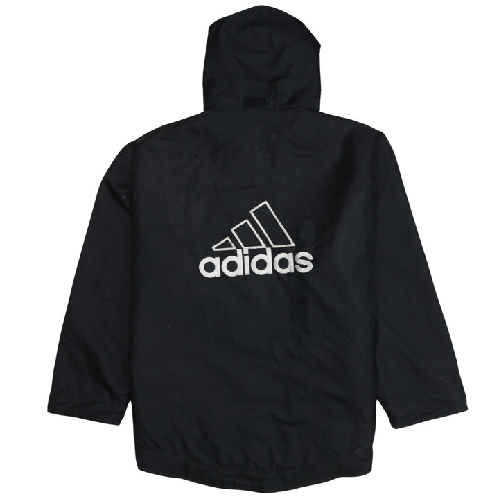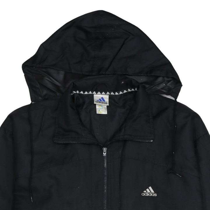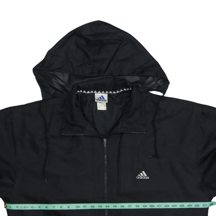 Adidas, Adidas jacket, Adidas windbreaker, black Adidas jacket, black hooded jacket, men's Adidas, men's black jacket, men's hooded jacket, full zip jacket, full zip windbreaker, Adidas embroidered logo, big logo back, large size jacket, men's size L, relaxed fit jacket, oversized fit jacket, casual outerwear, sportswear jacket, athletic jacket, street jacket, track jacket, lightweight jacket, shell jacket, polyester jacket, wool blend jacket, hooded windbreaker, drawstring hood jacket, zip front jacket, front pockets jacket, logo back jacket, classic Adidas style, everyday jacket, casual sports jacket, training jacket, layering piece, black outerwear, men's casual coat, men's outer layer, Adidas big logo, Adidas black windbreaker, Adidas hooded windbreaker, men's sports coat, vintage Adidas jacket, pre-owned Adidas, A grade vintage, thrift Adidas, second hand Adidas, large black hooded jacket, track top style jacket