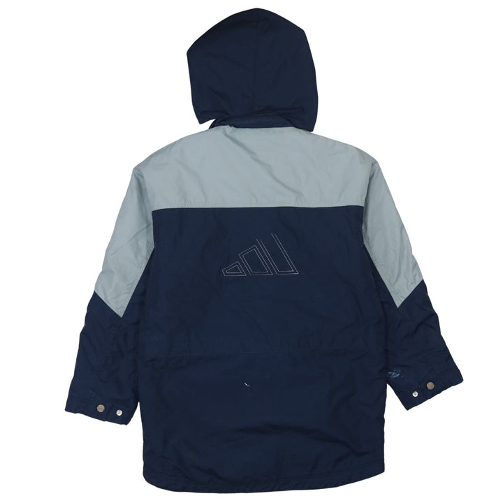Adidas, Adidas jacket, Adidas windbreaker, Adidas track jacket, Adidas outerwear, navy Adidas jacket, blue Adidas windbreaker, women’s Adidas jacket, women’s Large Adidas, Large windbreaker, Large track jacket, navy blue jacket, light grey panels, three stripe sleeves, detachable hood jacket, snap pocket jacket, full zip Adidas, logo jacket, embroidered logo, sportswear jacket, casual jacket, everyday coat, lightweight coat, shell jacket, polyester jacket, wool blend lining, relaxed fit jacket, oversized fit, street style jacket, athletic outerwear, training jacket, walking jacket, festival jacket, commuter jacket, zip up jacket, longline jacket, hip length jacket, collared jacket, hooded windbreaker, removable hood, branded jacket, logo back detail, women’s outerwear, women’s casual coat, women’s sports jacket, navy windbreaker, blue grey colour block, classic Adidas style, three stripes design, pre-owned Adidas, second hand Adidas jacket