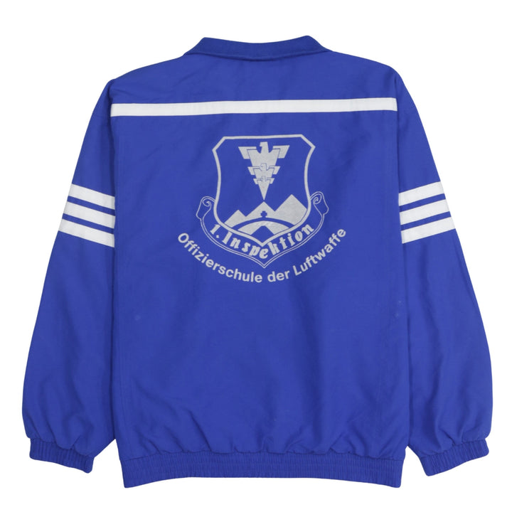 Adidas, Adidas jacket, Adidas windbreaker, Adidas track jacket, royal blue jacket, blue windbreaker, men's Adidas jacket, men's windbreaker, men's track top, medium Adidas, size M Adidas, three stripe sleeves, embroidered logo, Adidas embroidered logo, full zip jacket, mesh lined jacket, lightweight jacket, casual outerwear, training jacket, sports jacket, athletic jacket, track top, shell jacket, polyester jacket, wool blend jacket, elasticated cuffs, elastic hem, zip pockets, stand collar jacket, royal blue track jacket, white stripe sleeves, graphic back print, crest back print, Luftwaffe print jacket, 1. Inspektion jacket, Offizierschule der Luftwaffe jacket, classic Adidas, archive Adidas, blue Adidas windbreaker, everyday jacket, layering piece, casual sportswear top, outdoor running jacket, gym cover up, football training jacket, street casual jacket, men's outerwear, men's sports top, vintage Adidas jacket, Adidas fan gift