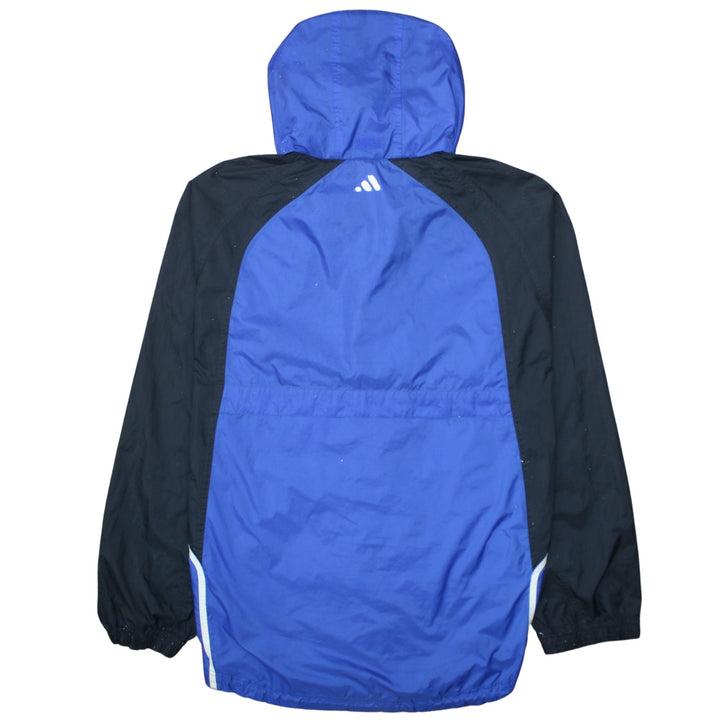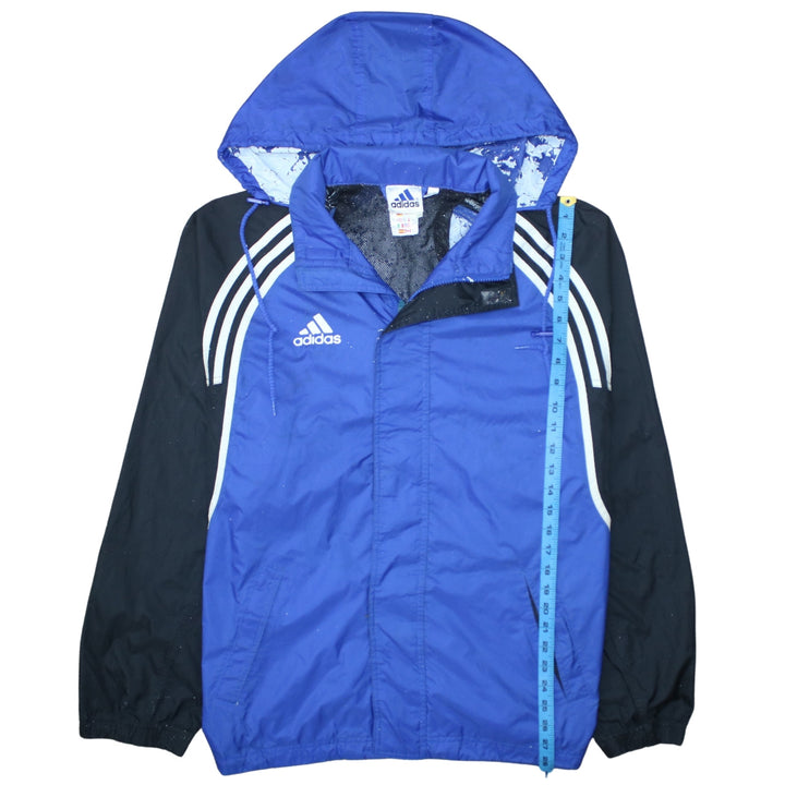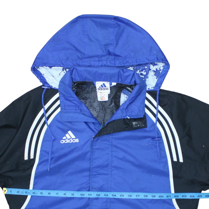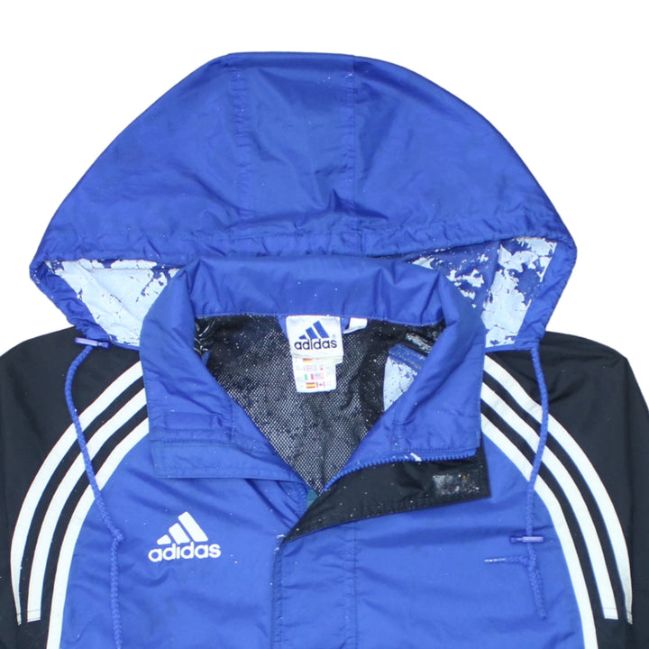 Adidas, Adidas jacket, Adidas windbreaker, Adidas hooded jacket, Adidas track jacket, blue Adidas jacket, blue hooded windbreaker, men's Adidas jacket, men's blue jacket, men's medium jacket, medium Adidas windbreaker, three stripe jacket, Adidas three stripes, embroidered logo jacket, hooded sports jacket, lightweight jacket, nylon shell jacket, polyester jacket, casual outerwear, training jacket, running jacket, football jacket, track top, Adidas outerwear, blue black jacket, colour block jacket, zip front jacket, zip pockets jacket, elasticated cuffs jacket, relaxed fit jacket, oversized fit jacket, A grade condition, pre-owned Adidas, classic sportswear, shell jacket, everyday jacket, festival jacket, waterproof style jacket, Adidas logo, men's casual jacket, layering piece, spring jacket, autumn jacket, activewear jacket, sports coat, athleisure jacket, Adidas fan, collectible Adidas, wardrobe staple, Adidas windbreaker medium, Adidas blue hooded coat