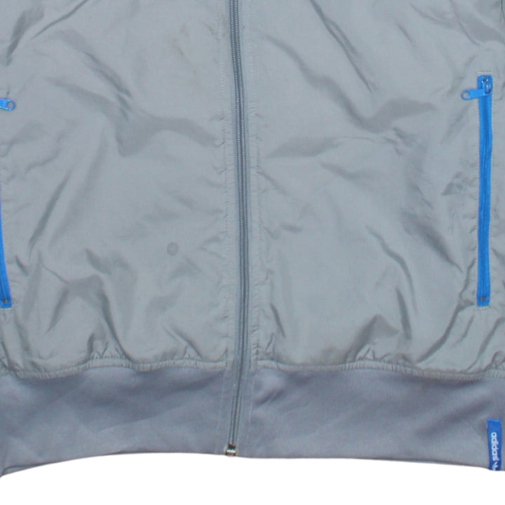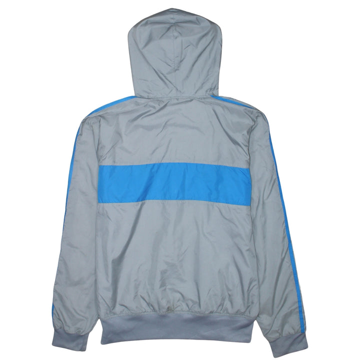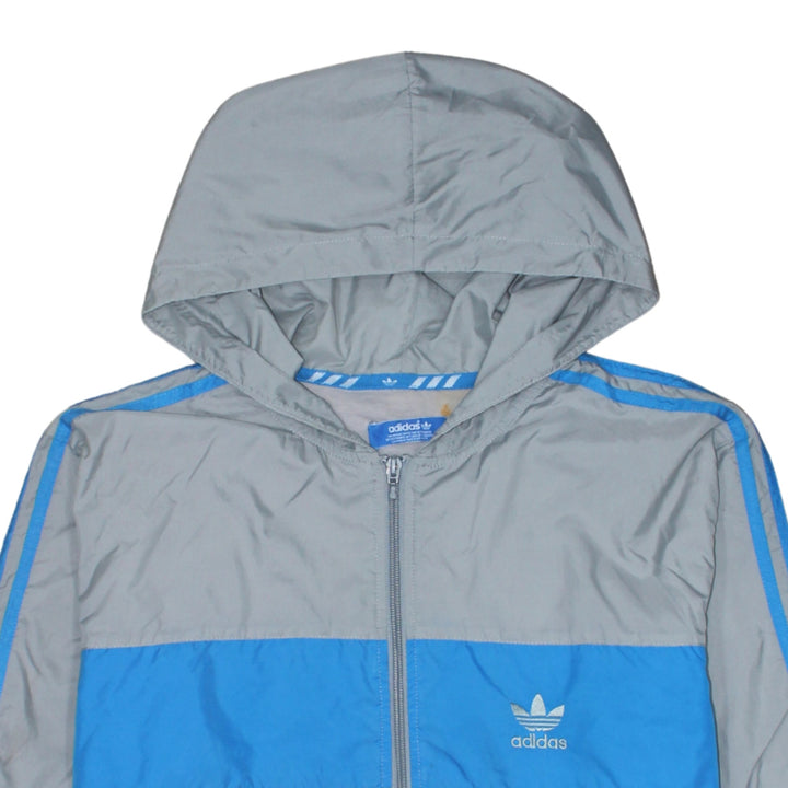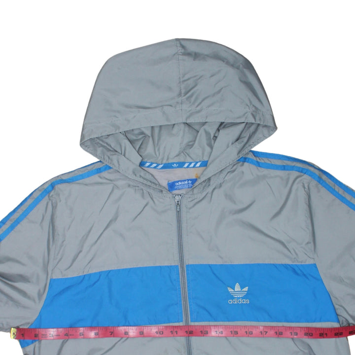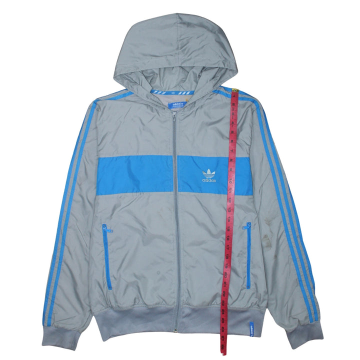Adidas Grey Blue Hooded Jacket Men's Medium Trefoil Logo Three Stripe Zip Windbreaker