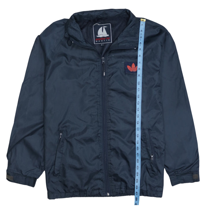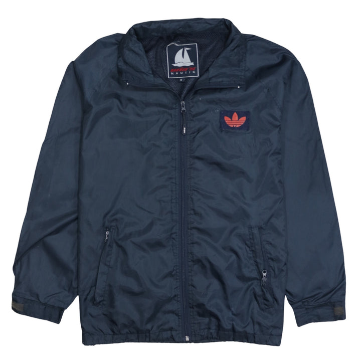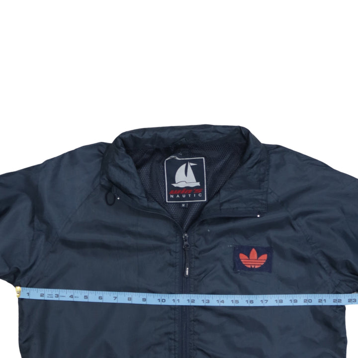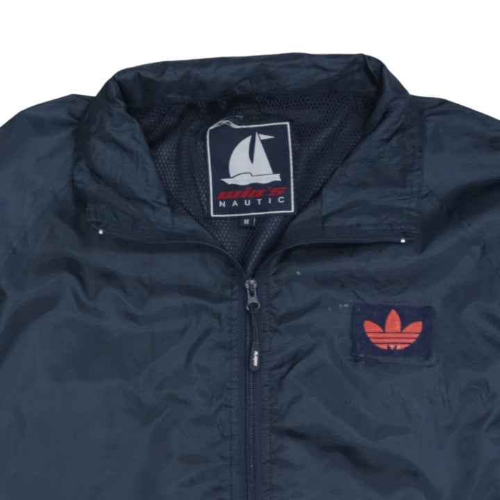 Adidas, Adidas jacket, Adidas windbreaker, Adidas track jacket, navy Adidas, navy blue jacket, navy windbreaker, men's Adidas jacket, men's windbreaker, men's track top, full zip jacket, zip front jacket, mesh lining, embroidered Trefoil logo, Trefoil patch, nylon jacket, polyamide shell, polyester lining, lightweight jacket, casual jacket, sports jacket, athletic jacket, outdoor jacket, training jacket, medium size jacket, men's medium, relaxed fit jacket, elastic cuffs, elastic hem, zip pockets, funnel neck jacket, shell jacket, Adidas outerwear, classic Adidas, navy sports jacket, everyday jacket, layering piece, casual wear, activewear top, track top, windbreaker coat, Adidas navy windbreaker, Adidas medium navy, logo jacket, embroidered logo jacket, waterproof style jacket, rain resistant jacket