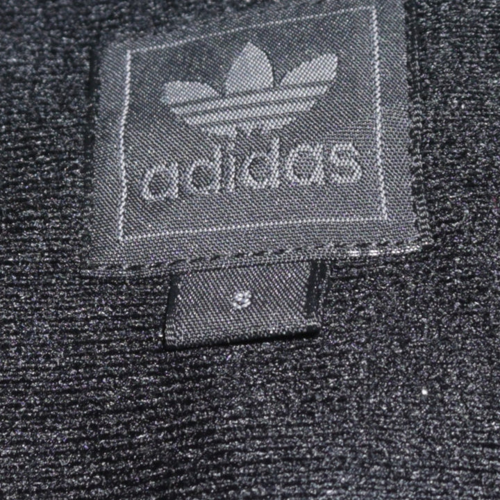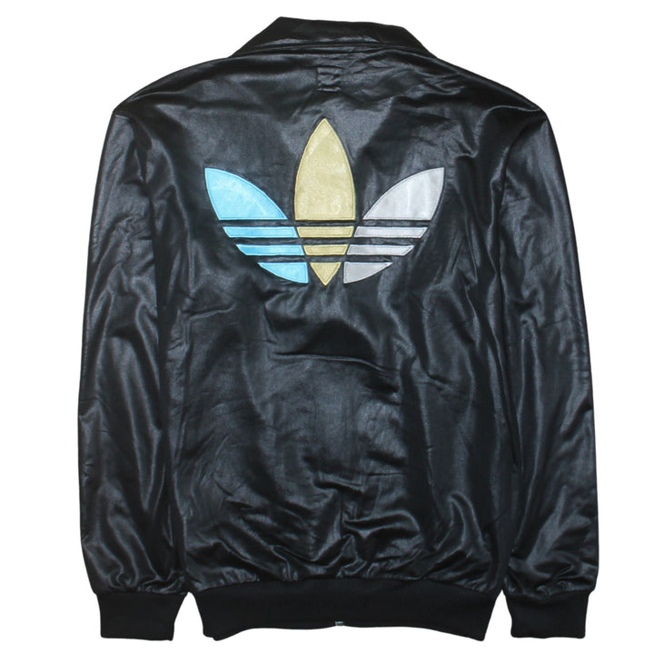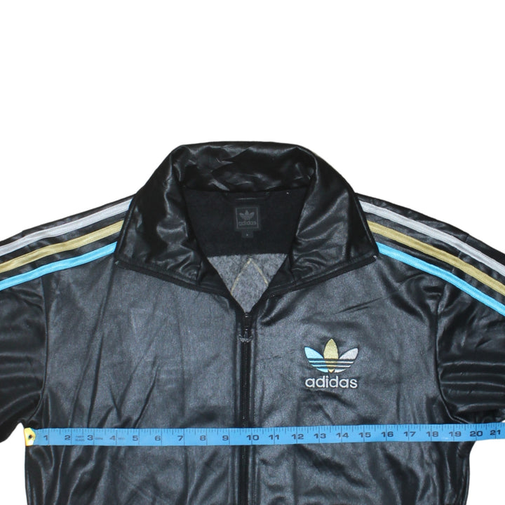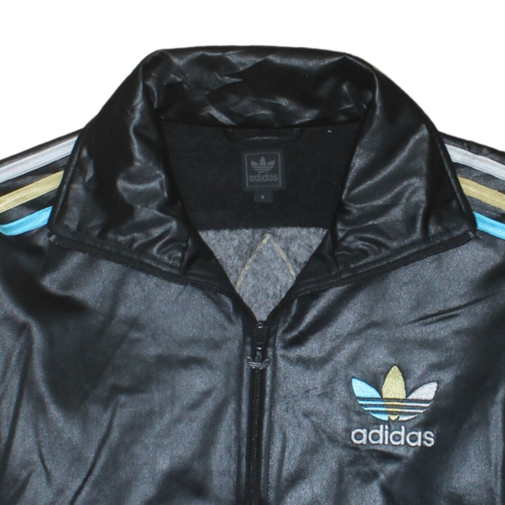 Adidas, Adidas jacket, Adidas track jacket, Adidas windbreaker, Adidas Chile 62, Adidas Trefoil, Trefoil logo, black Adidas jacket, black track jacket, men's Adidas jacket, men's small jacket, size small, small track top, polyester jacket, full zip jacket, zip front jacket, three stripe sleeves, multicolour stripes, blue stripe, gold stripe, silver stripe, ribbed cuffs, ribbed hem, lightweight jacket, casual jacket, sportswear jacket, training jacket, athleisure jacket, outerwear, shell jacket, bomber style track top, Adidas originals, Adidas originals jacket, Chile 62 track top, festival jacket, layering piece, everyday jacket, classic Adidas, embroidered logo jacket, statement back logo, street casual jacket, black polyester track top, men's outerwear, collectible Adidas piece, pre owned Adidas, second hand Adidas jacket
