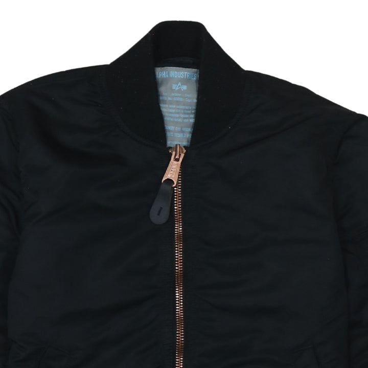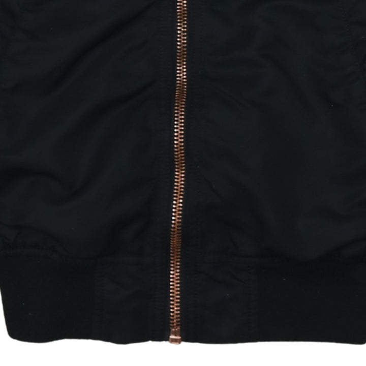 Alpha Industries, Alpha Industries jacket, Alpha bomber, black bomber jacket, women’s bomber jacket, women’s Alpha jacket, small bomber jacket, black flight jacket, padded bomber, casual jacket, everyday jacket, utility pocket jacket, sleeve zip pocket, ribbed hem jacket, ribbed cuffs, full zip jacket, metal zip, rose gold zip, nylon bomber, polyester bomber, wool blend jacket, classic bomber style, women’s outerwear, lightweight padded jacket, casual outerwear, relaxed fit jacket, aviation style jacket, flight inspired jacket, Alpha Industries women’s small, black casual coat, bomber coat, fall jacket, spring jacket, street casual jacket, minimalist bomber, plain black bomber, wardrobe staple, layering piece, hip length jacket, long sleeve jacket, snap pocket jacket, trendy bomber, stylish outerwear, women’s fashion jacket, pre-owned Alpha Industries, A grade condition, zipped jacket, insulated jacket, black polyester jacket