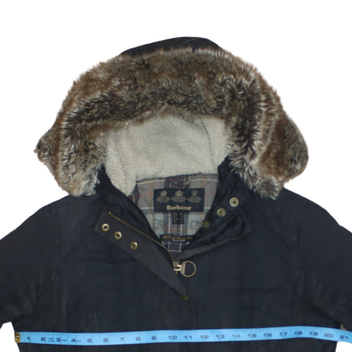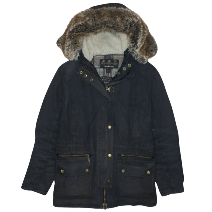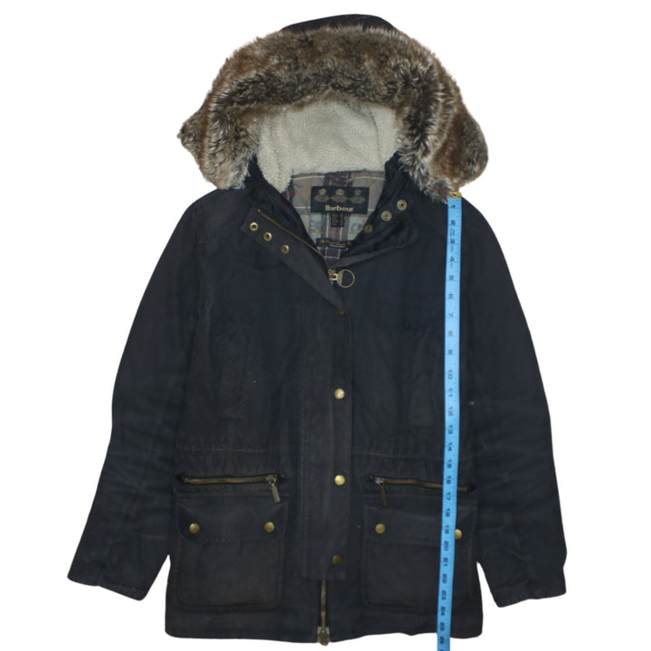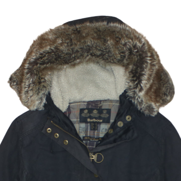 Barbour Black Hooded Parka Women’s Medium Faux Fur Lined Zip Pockets Wax Jacket